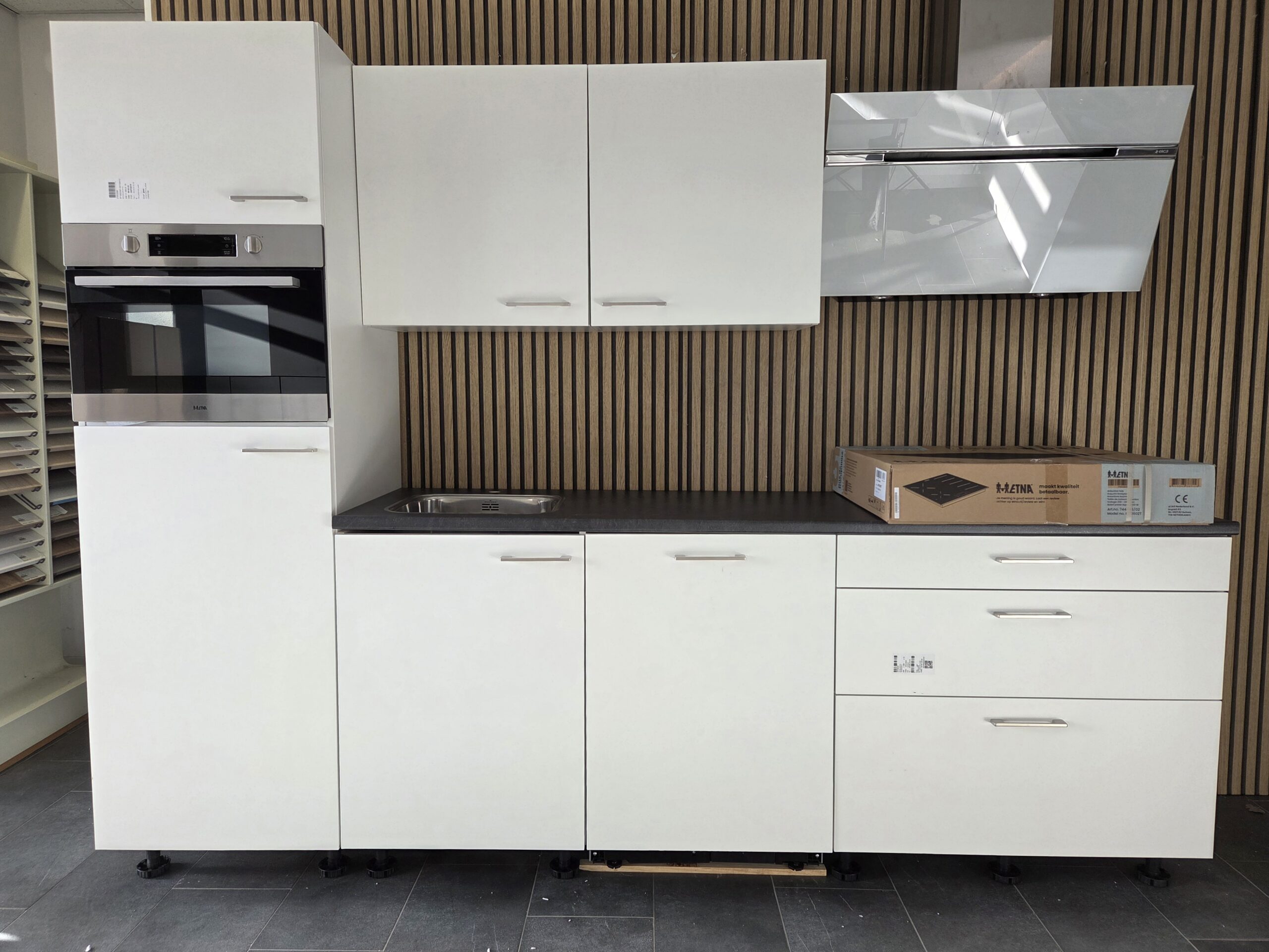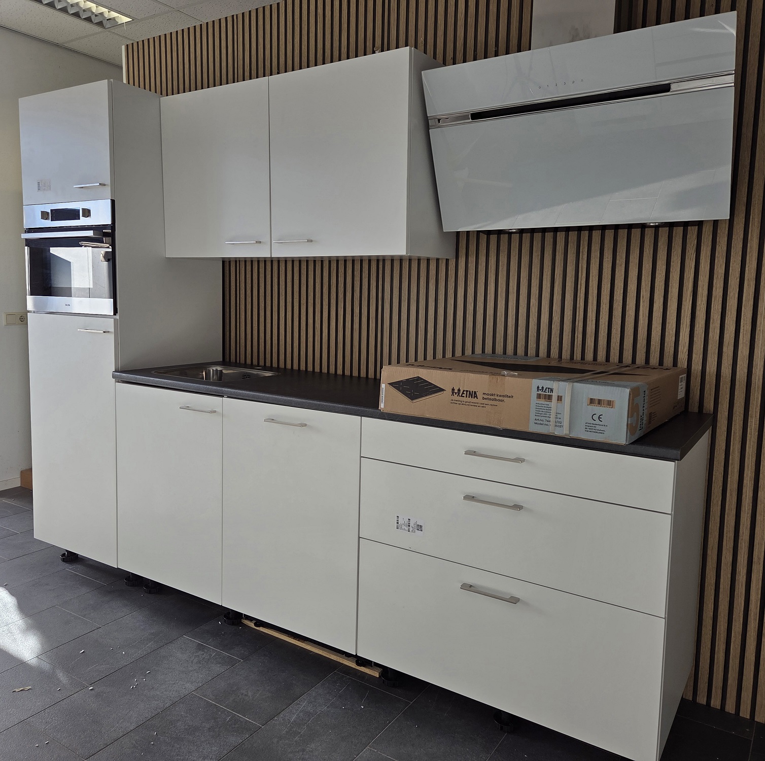 Afmeting ca. 270 cm breed / Bruynzeel ATLAS “W12 mat wit” Decor keuken inclusief VIJF Apparaten!