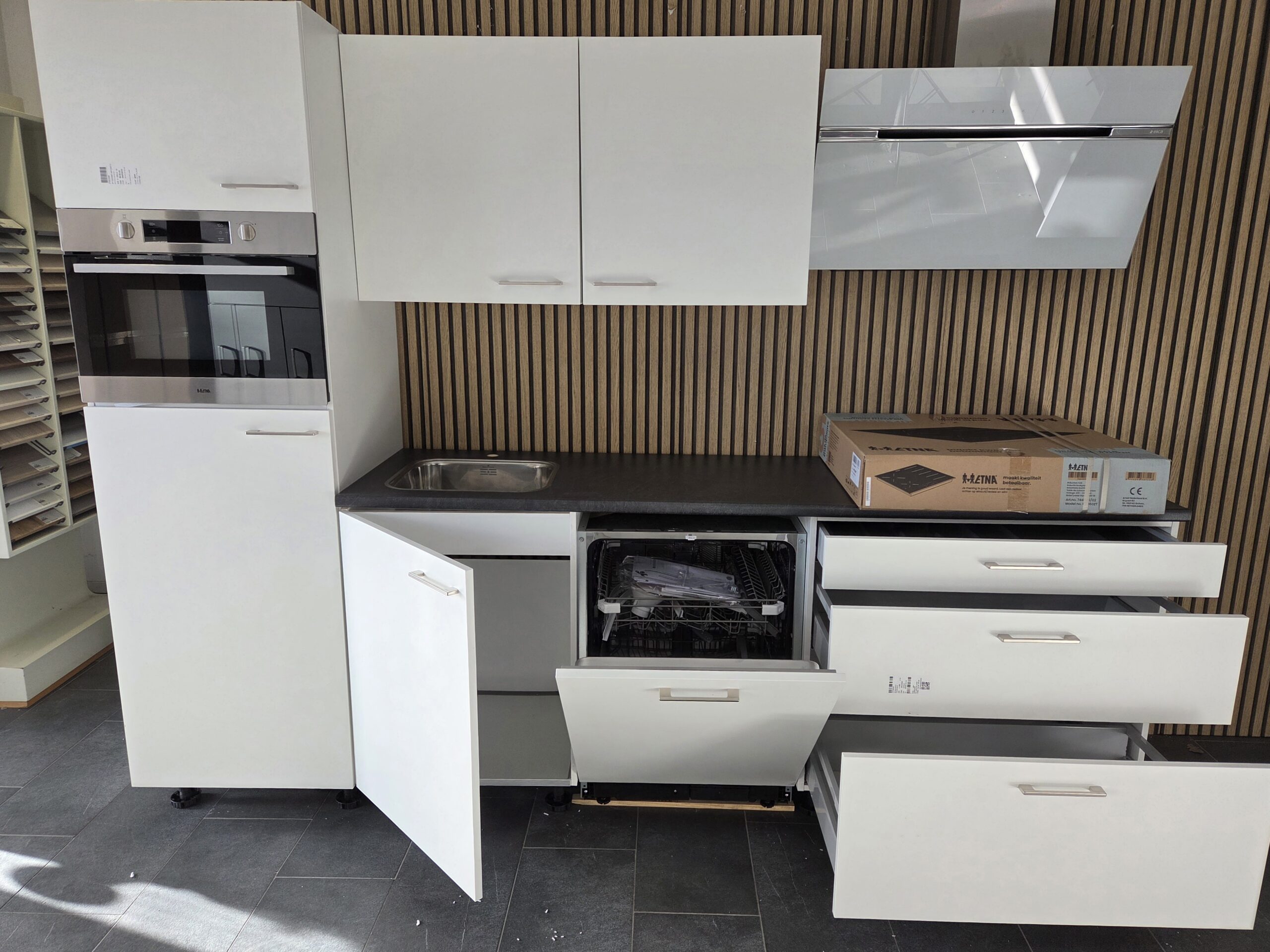 Compleet met MULTIPLEX werkblad met VLAKBOUW spoelbak, demping (softclosing) op alle lades, inclusief bovenkasten, VIJF Inbouw apparaten én DIRECT Leverbaar!