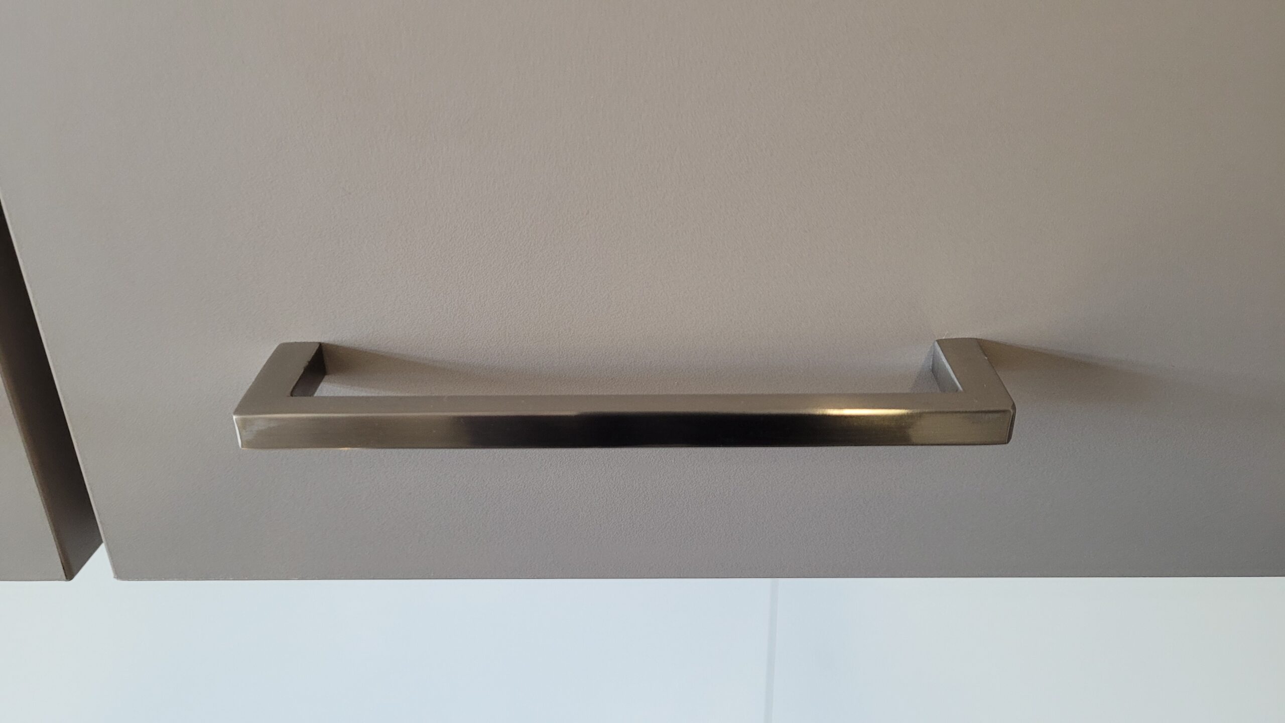 Deze keuken is uitgevoerd in een moderne “ATLAS LEEM” kleurstelling met mat zilverkleurige handgrepen.