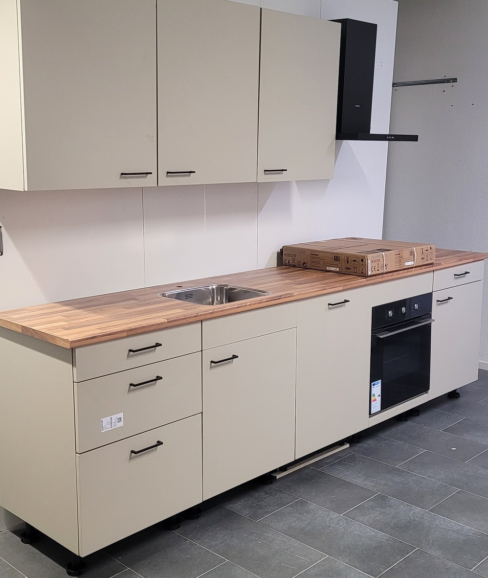| Afmeting | TECHNISCHE GEGEVENS: (onderbouw van links naar rechts) 60 cm (ladekast) x 60 cm (gootsteenkast) x 60 cm (vaatwasser) x 60 cm (ovenkast) x 60 cm Hoogte keukenopstelling: ca. 220 cm (bovenbouw van links naar rechts) 60 cm x 60 cm x 60 cm x 60 cm (afzuiger) |