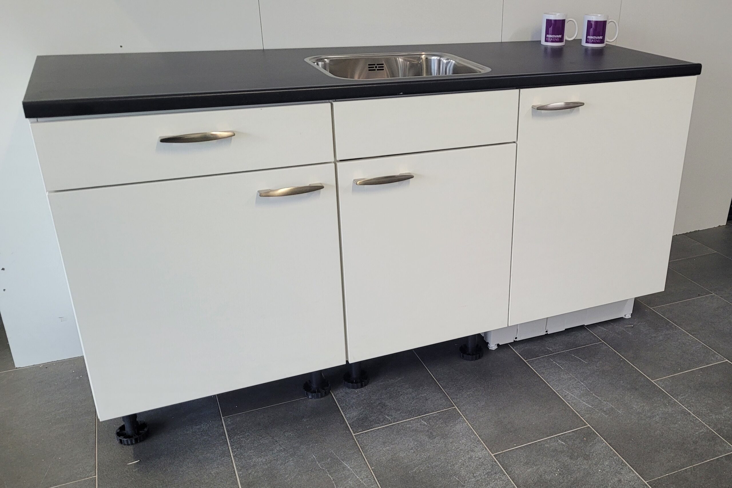 Complete keuken inclusief warm donkerkleurig kunststof werkblad met luxe vlakbouw spoelbak, degelijk scharnierwerk, stelpoten en bovenkasten.