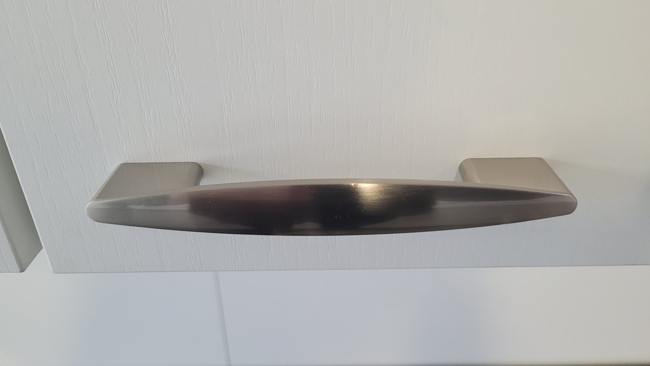 Deze keuken is uitgevoerd in een “Mat Wit / Essen Structuur” decor kleurstelling met zilverkleurige handgrepen.