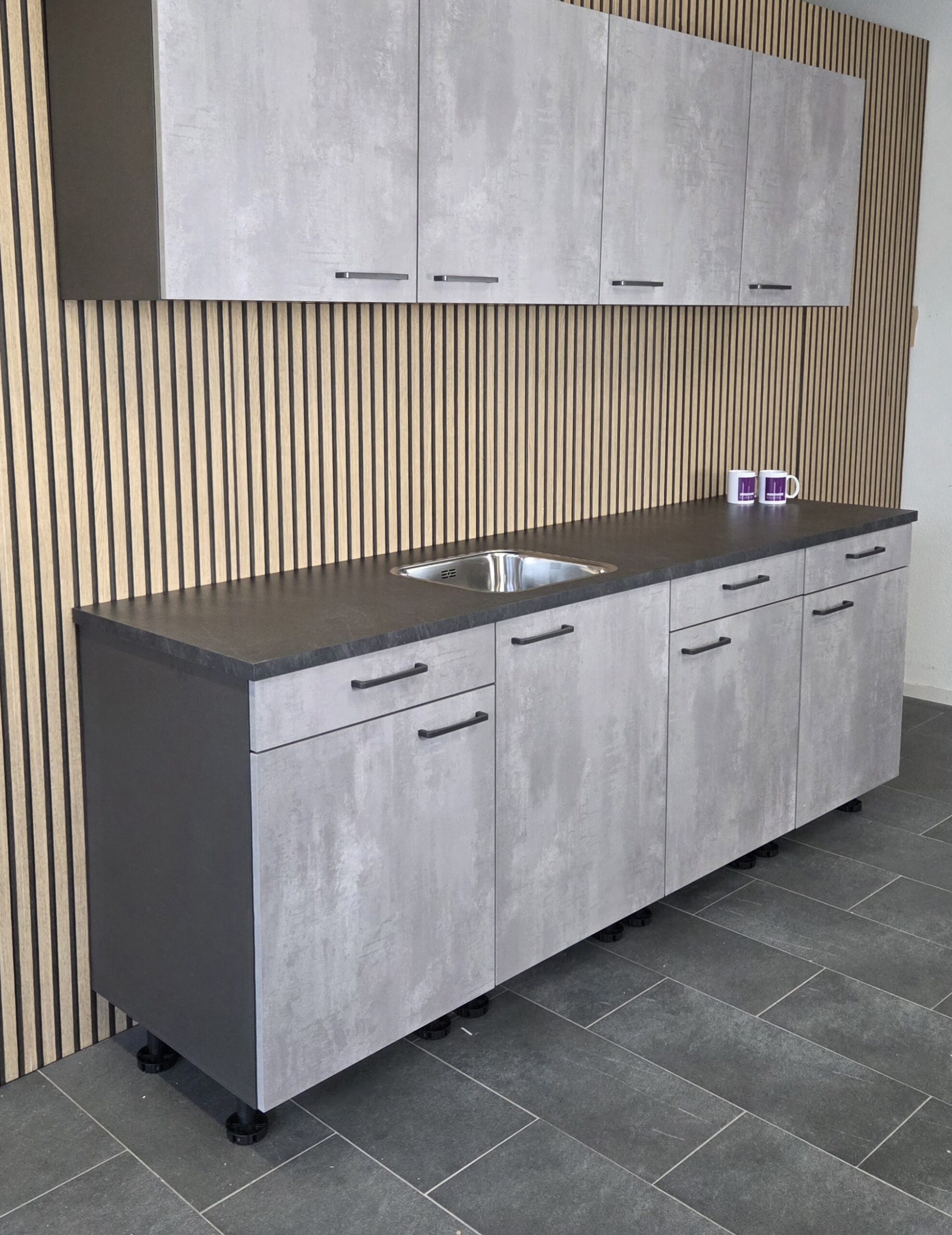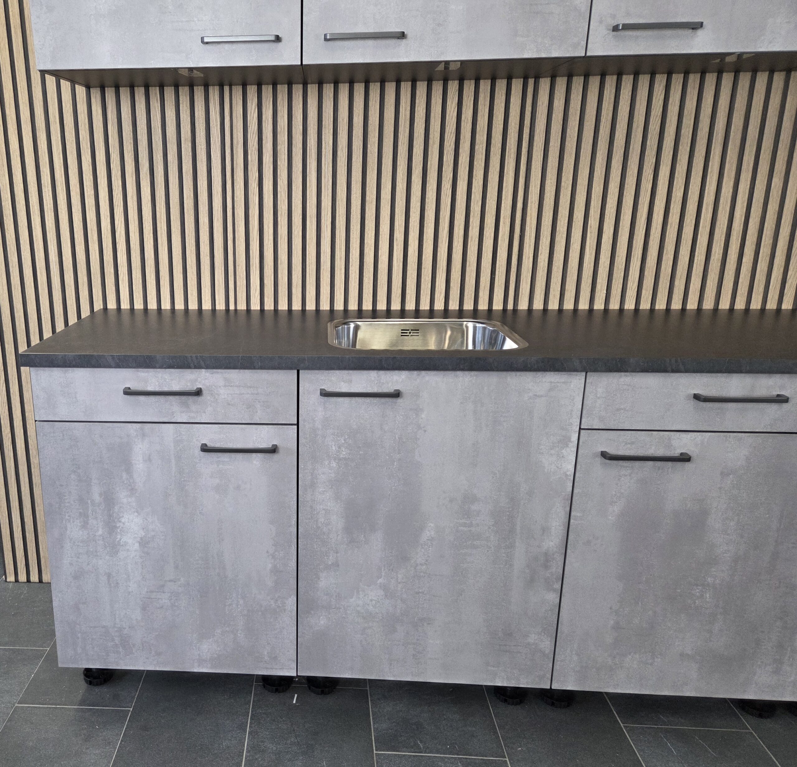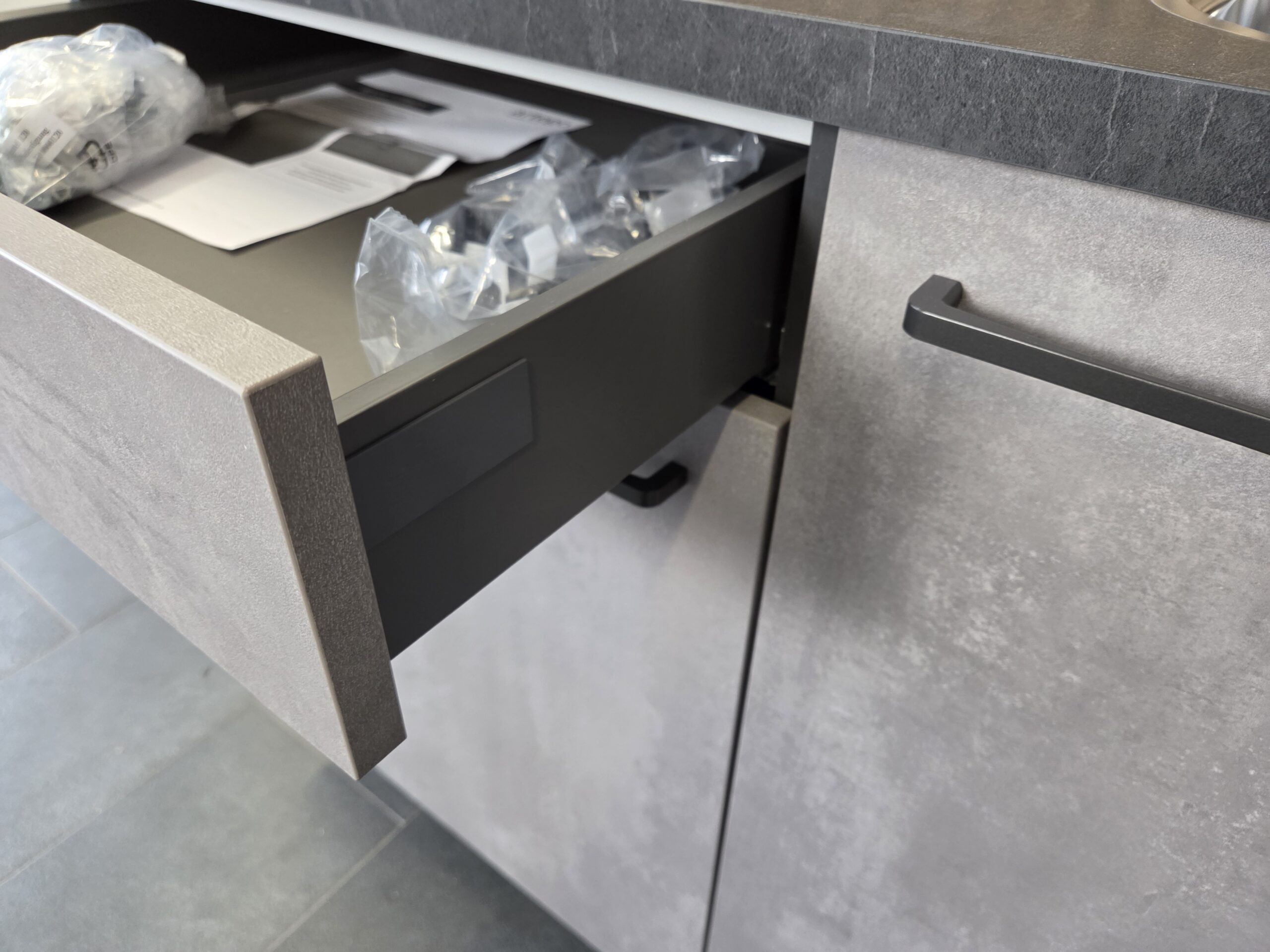 Deze keuken is uitgevoerd in een “BETON GRIJS”  decor kleurstelling met titanium kleur keukengrepen.