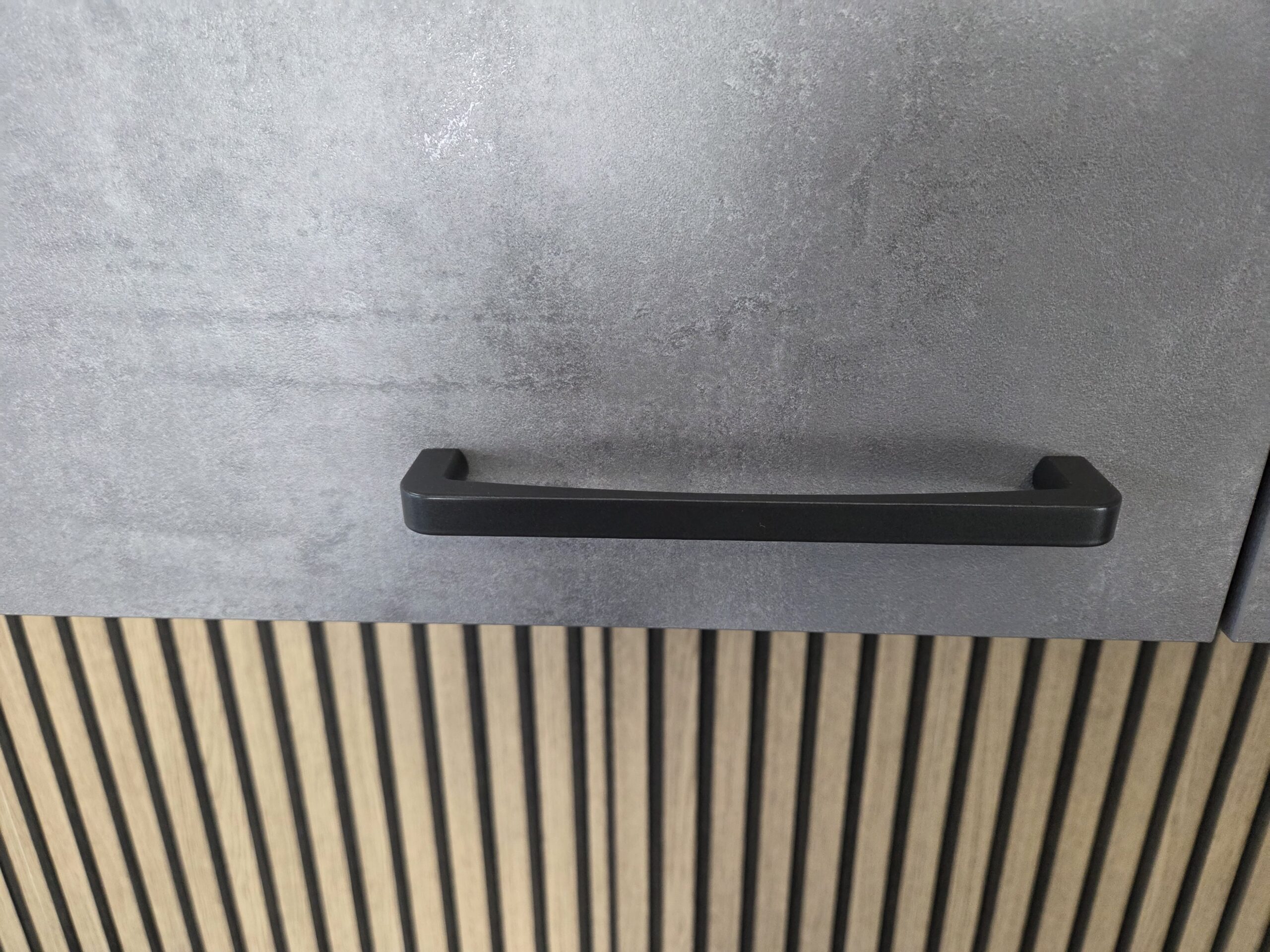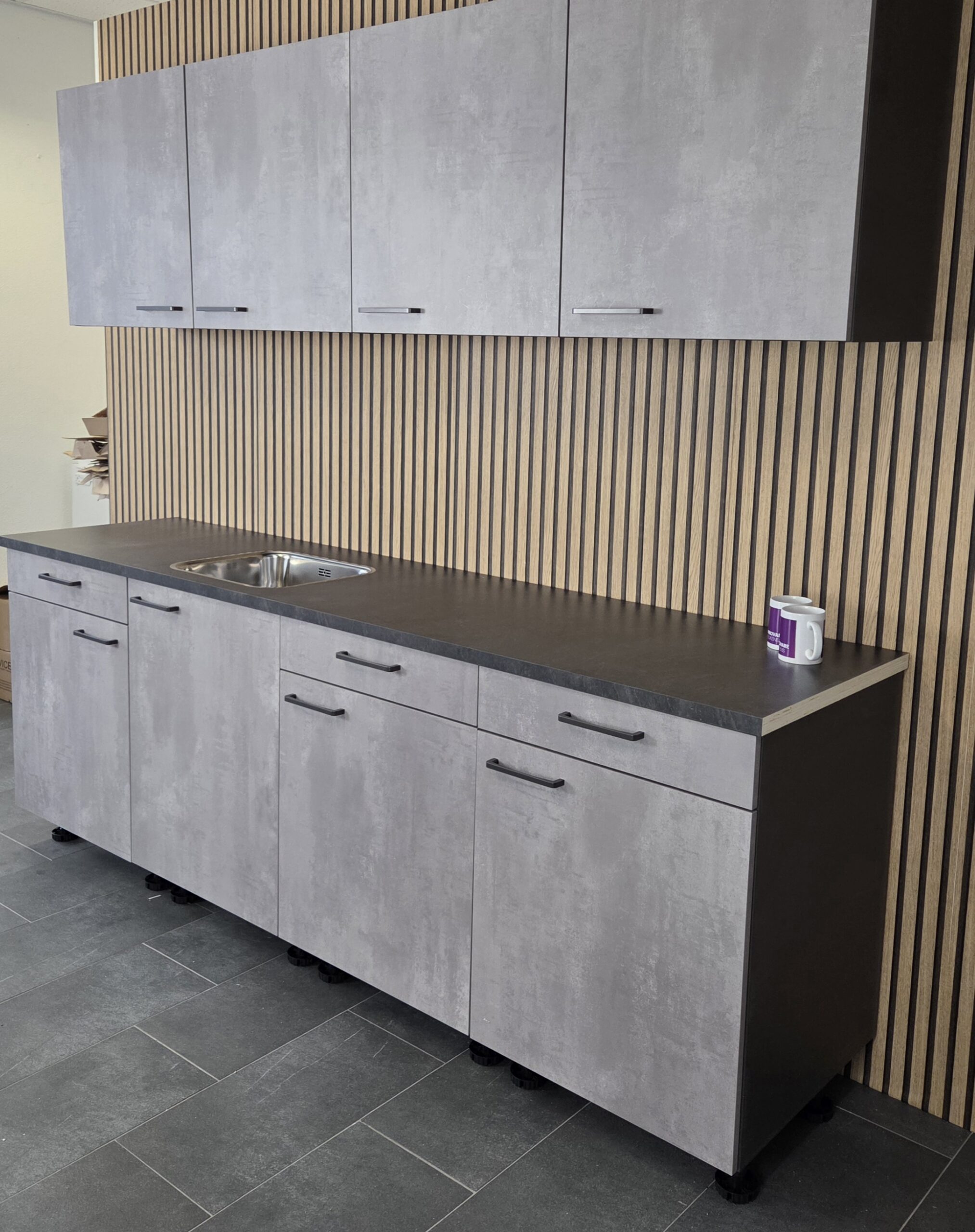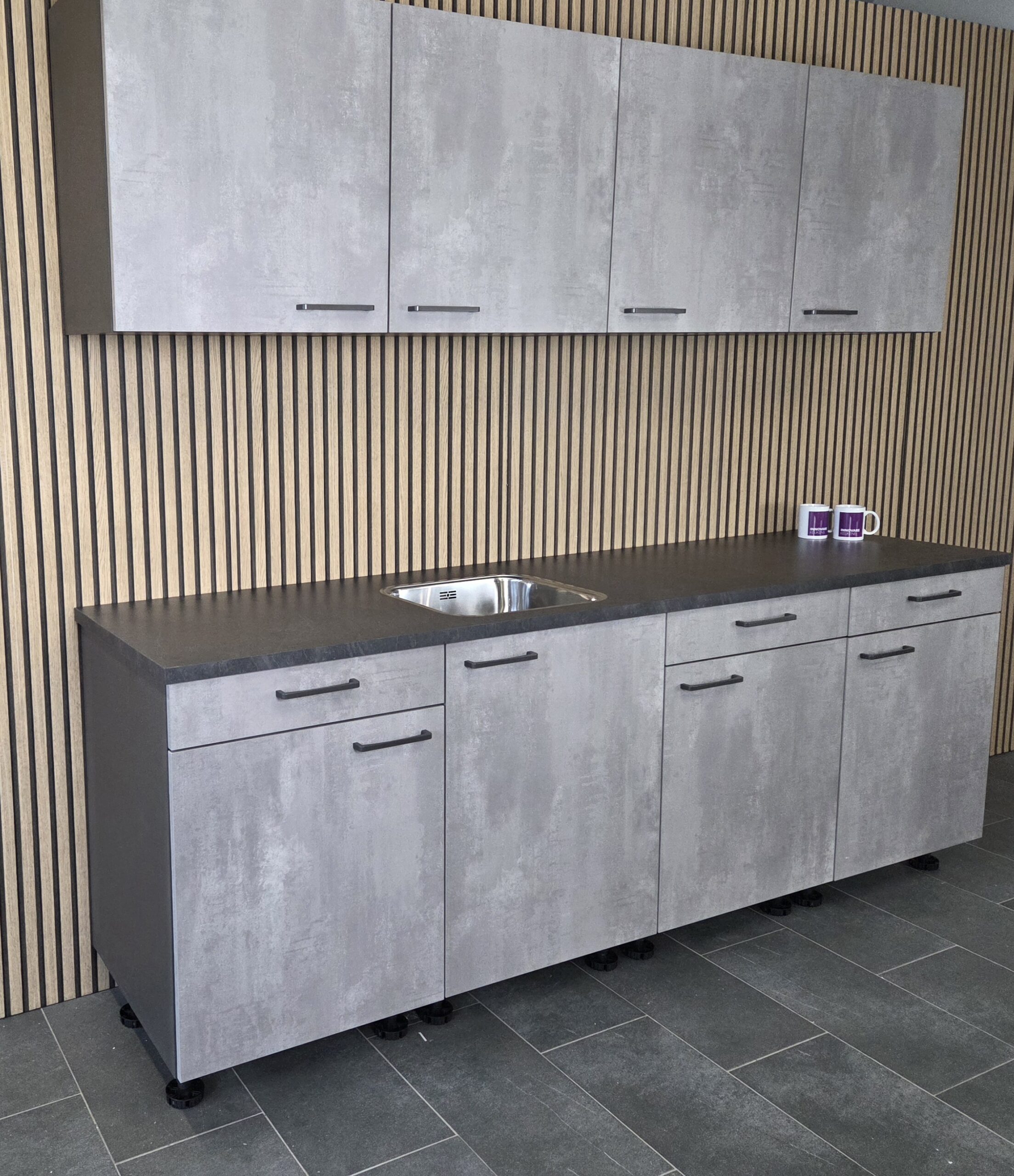 Deze keuken is uitgevoerd in een “BETON GRIJS”  decor kleurstelling met titanium kleur keukengrepen.