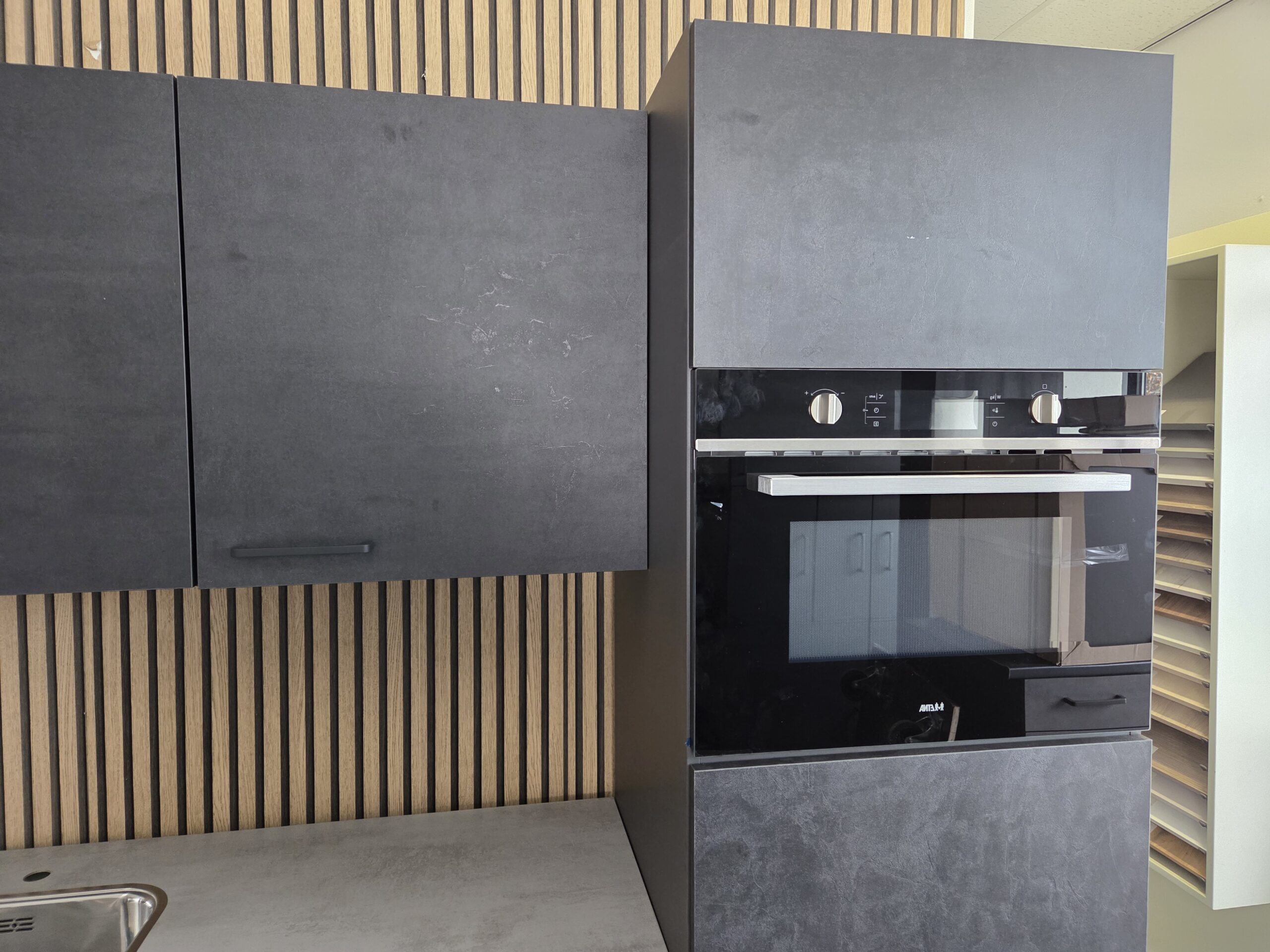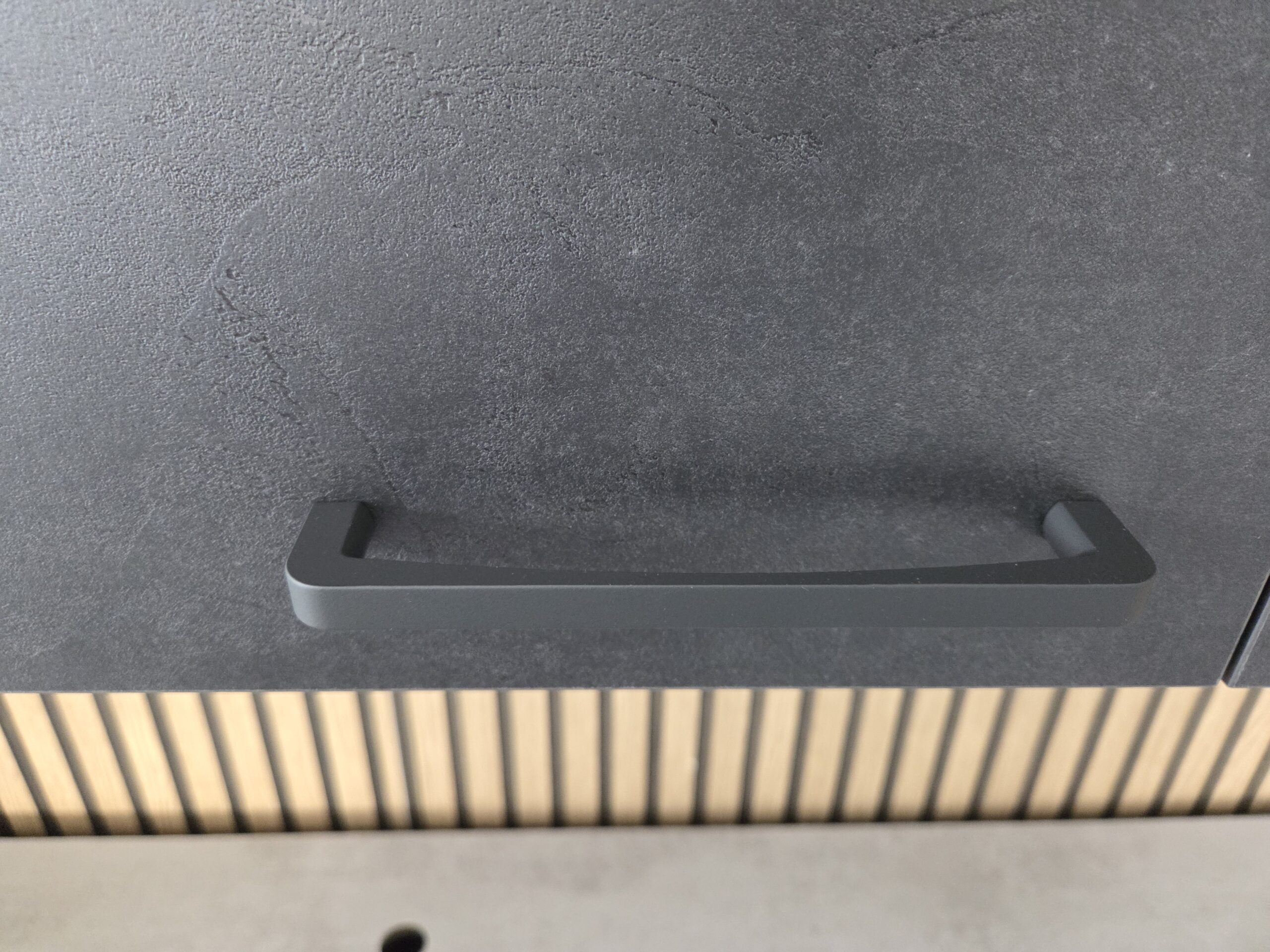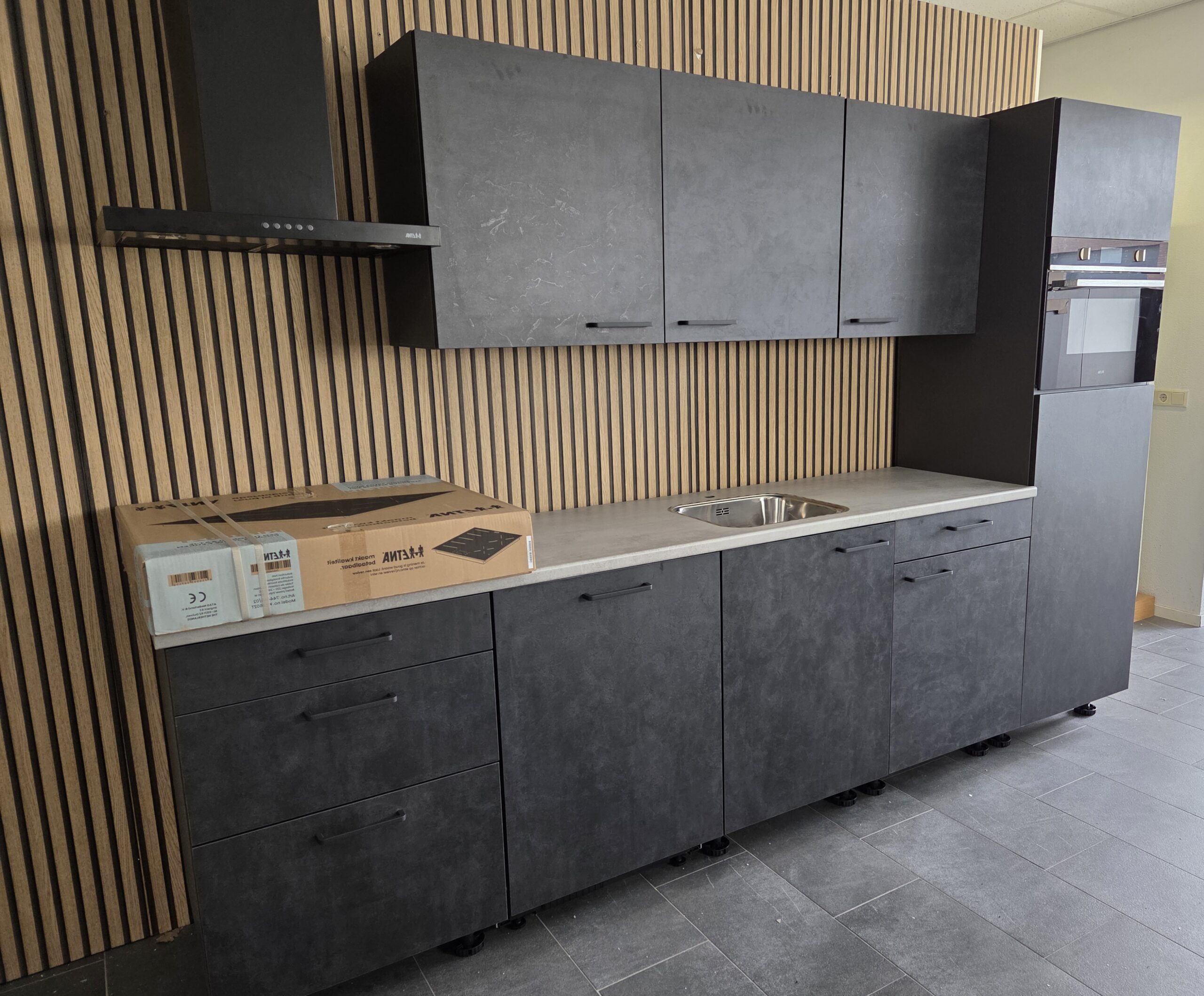 Deze keuken is uitgevoerd in een “BETON INFINITY”  decor kleurstelling met mat zwart kleurige keukengrepen.