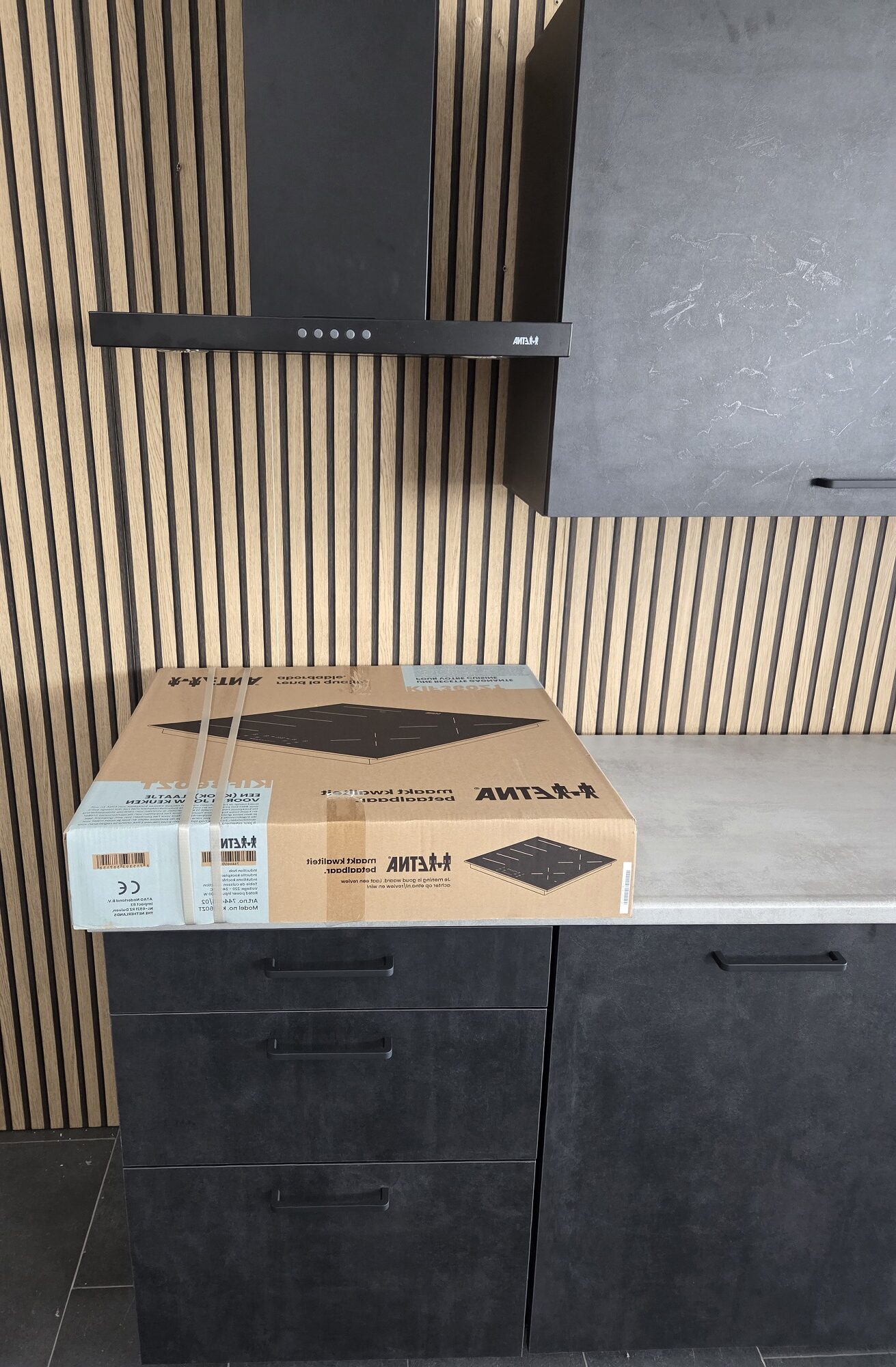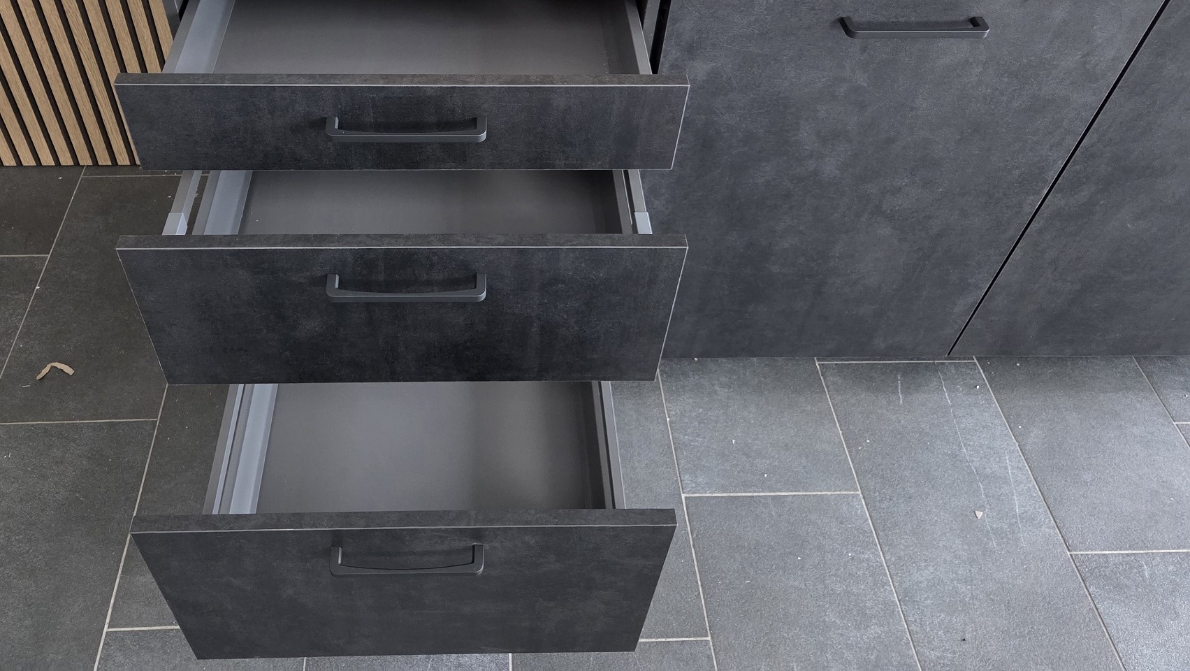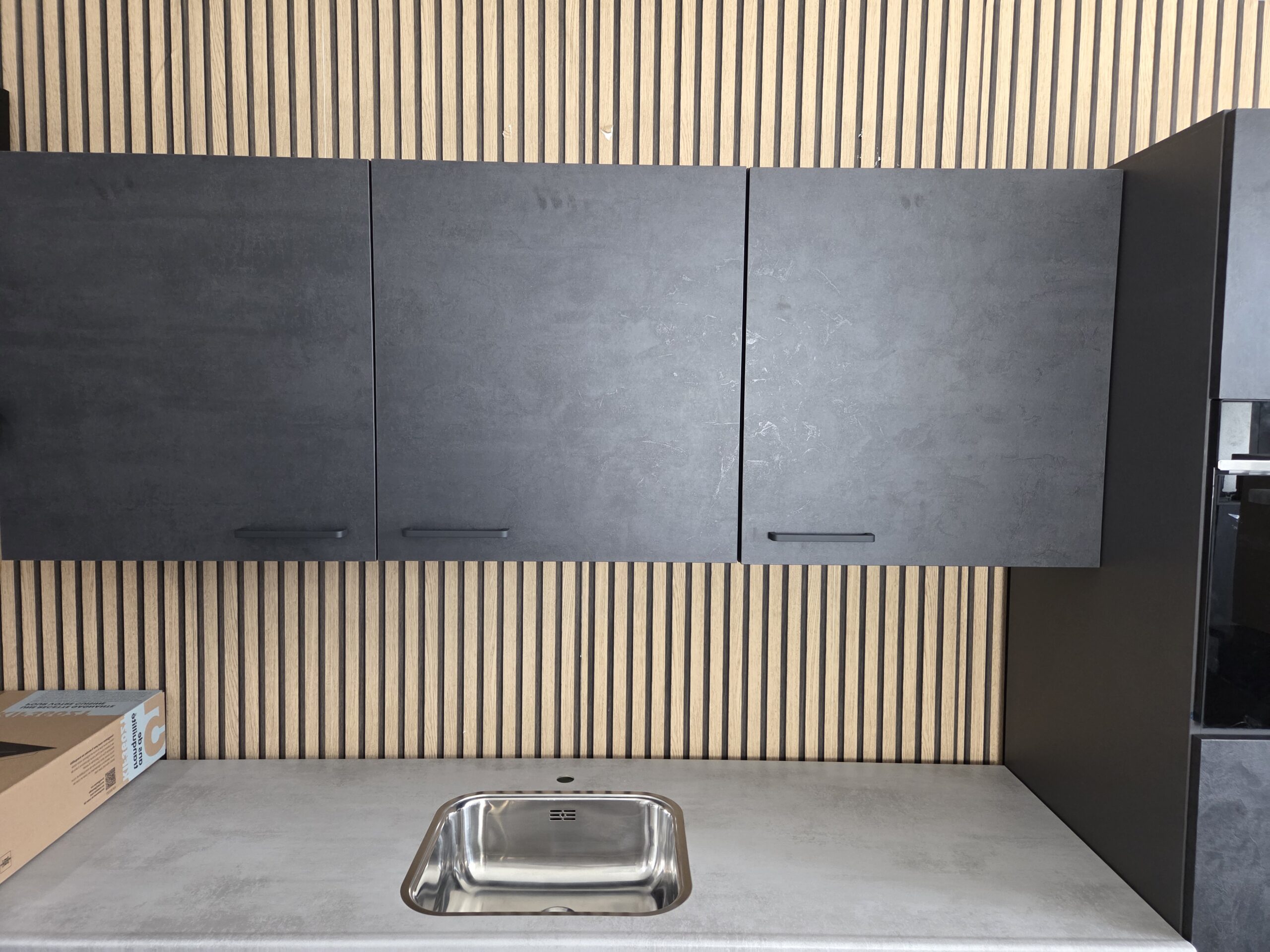 Deze keuken is uitgevoerd in een “BETON INFINITY”  decor kleurstelling met mat zwart kleurige keukengrepen.