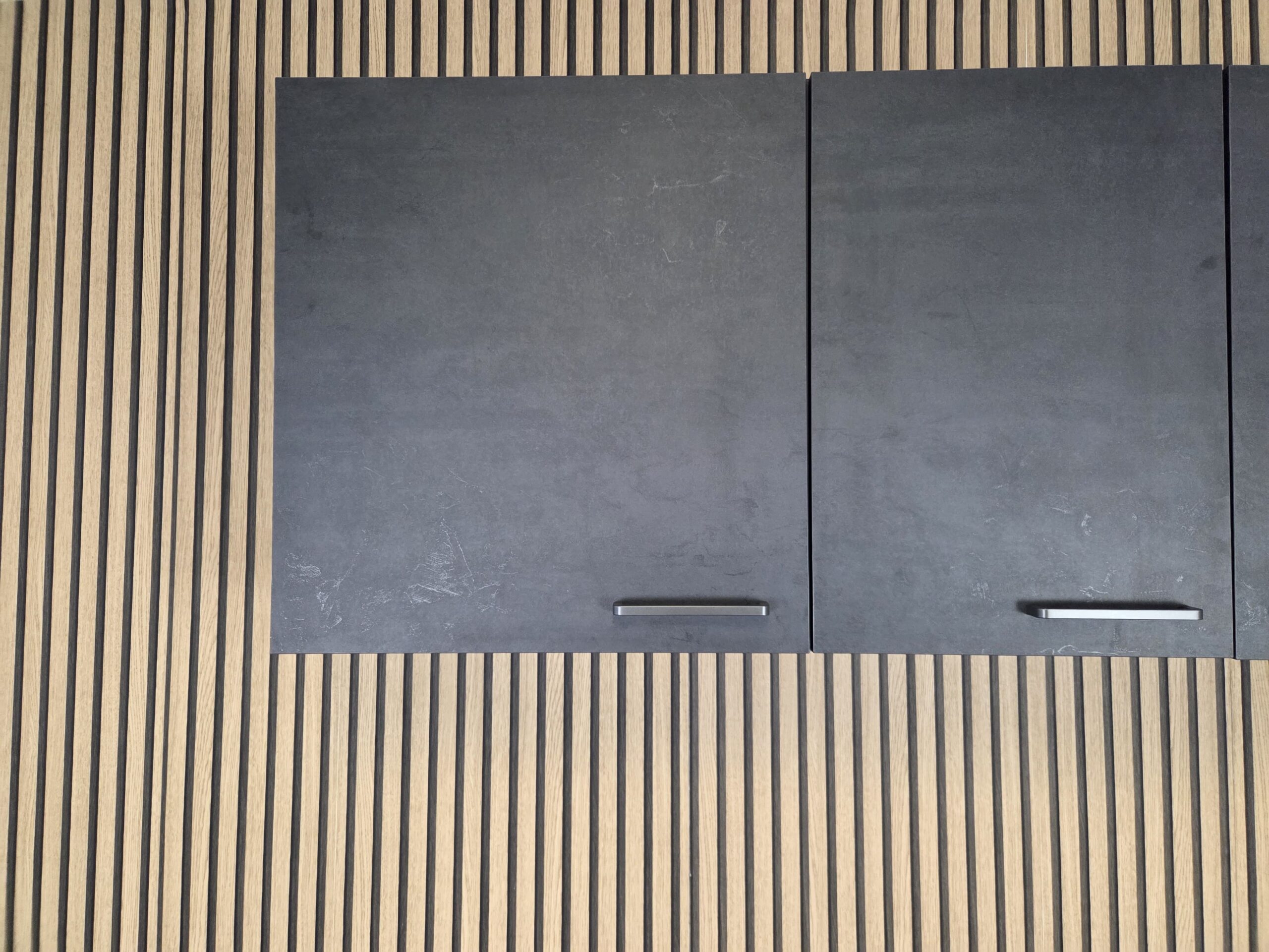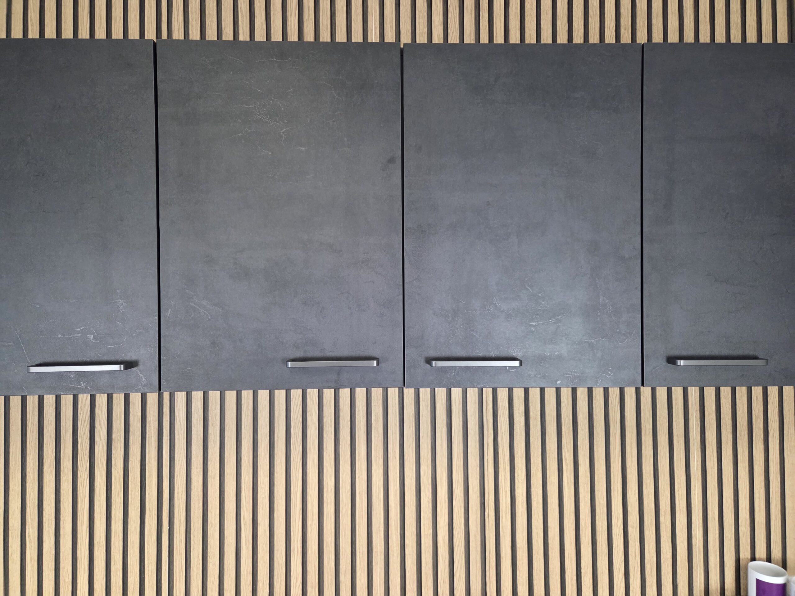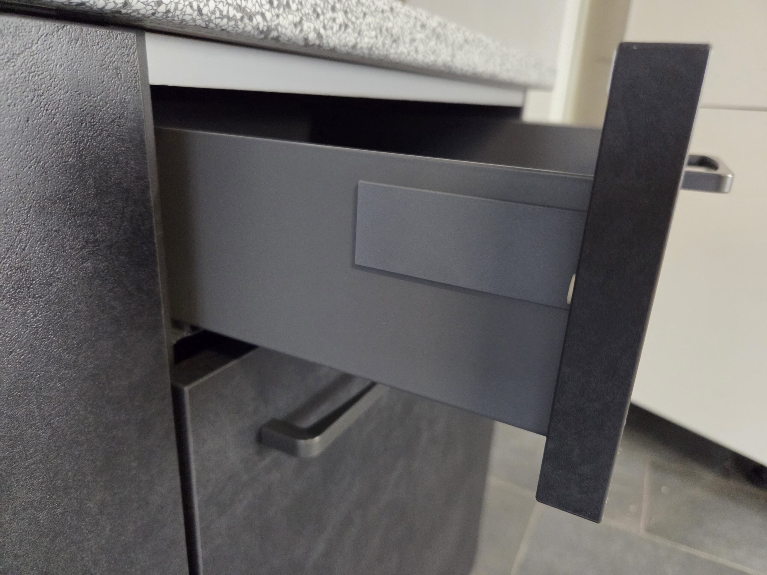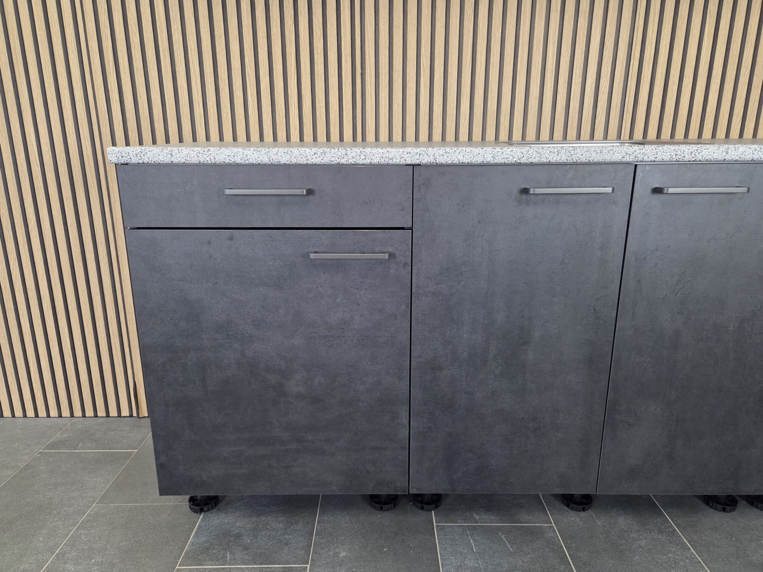 Deze keuken is uitgevoerd in een “BETON INFINITY” decor kleurstelling met titanium kleur keukengrepen.