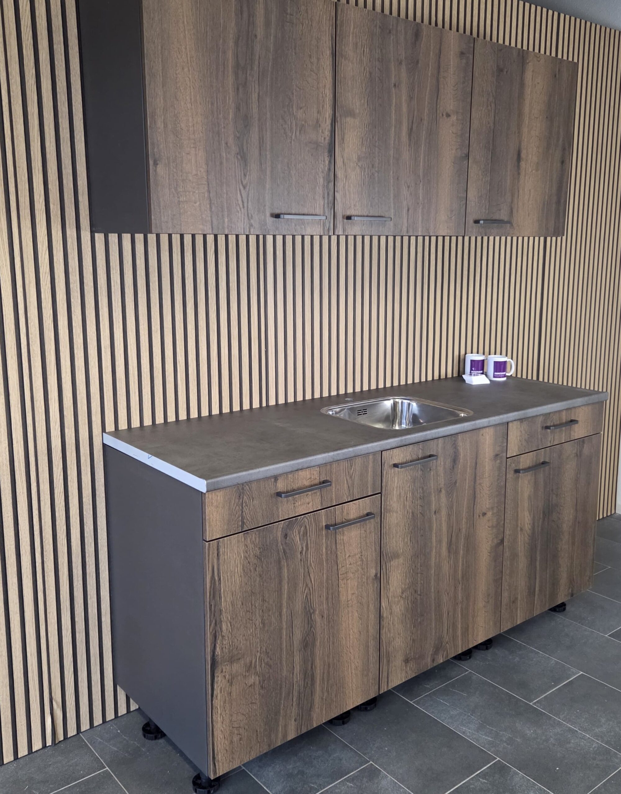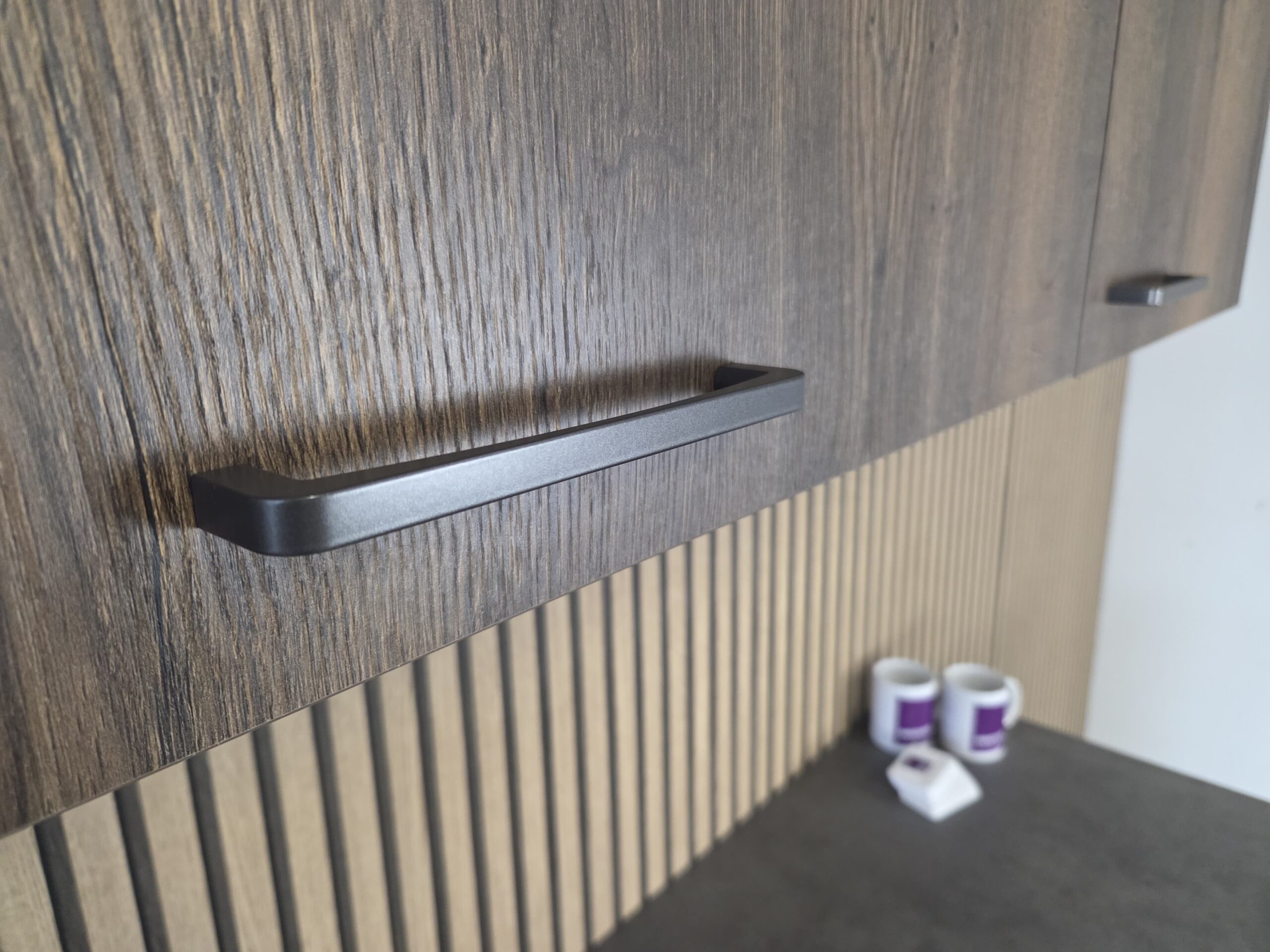 Deze keuken is uitgevoerd in een “BRUIN EIKEN HOUTLOOK” decor kleurstelling met titanium kleur keukengrepen.