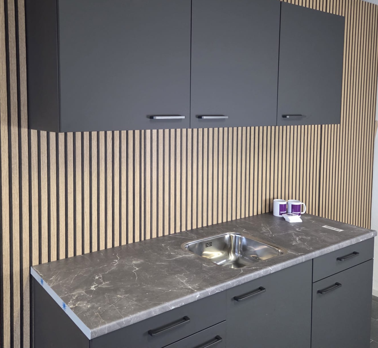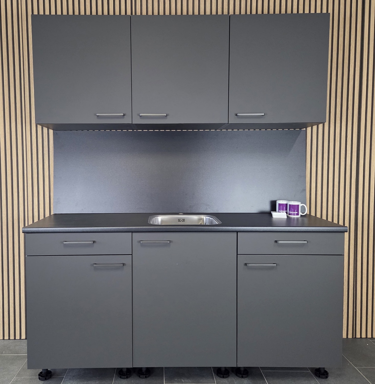 Deze keuken is uitgevoerd in een “Mat Grafiet” decor kleurstelling met titanium kleur keukengrepen.