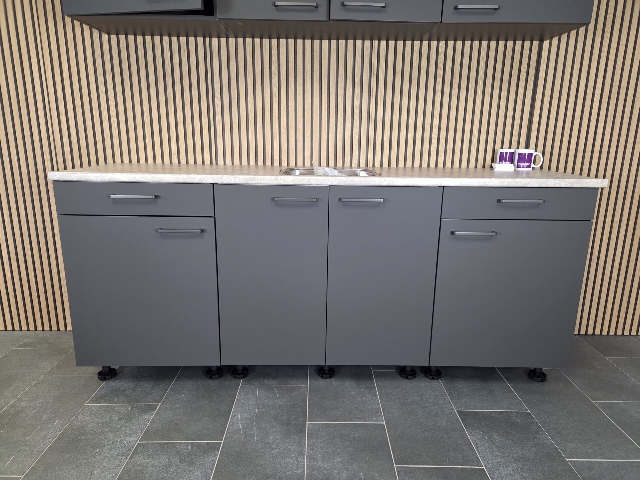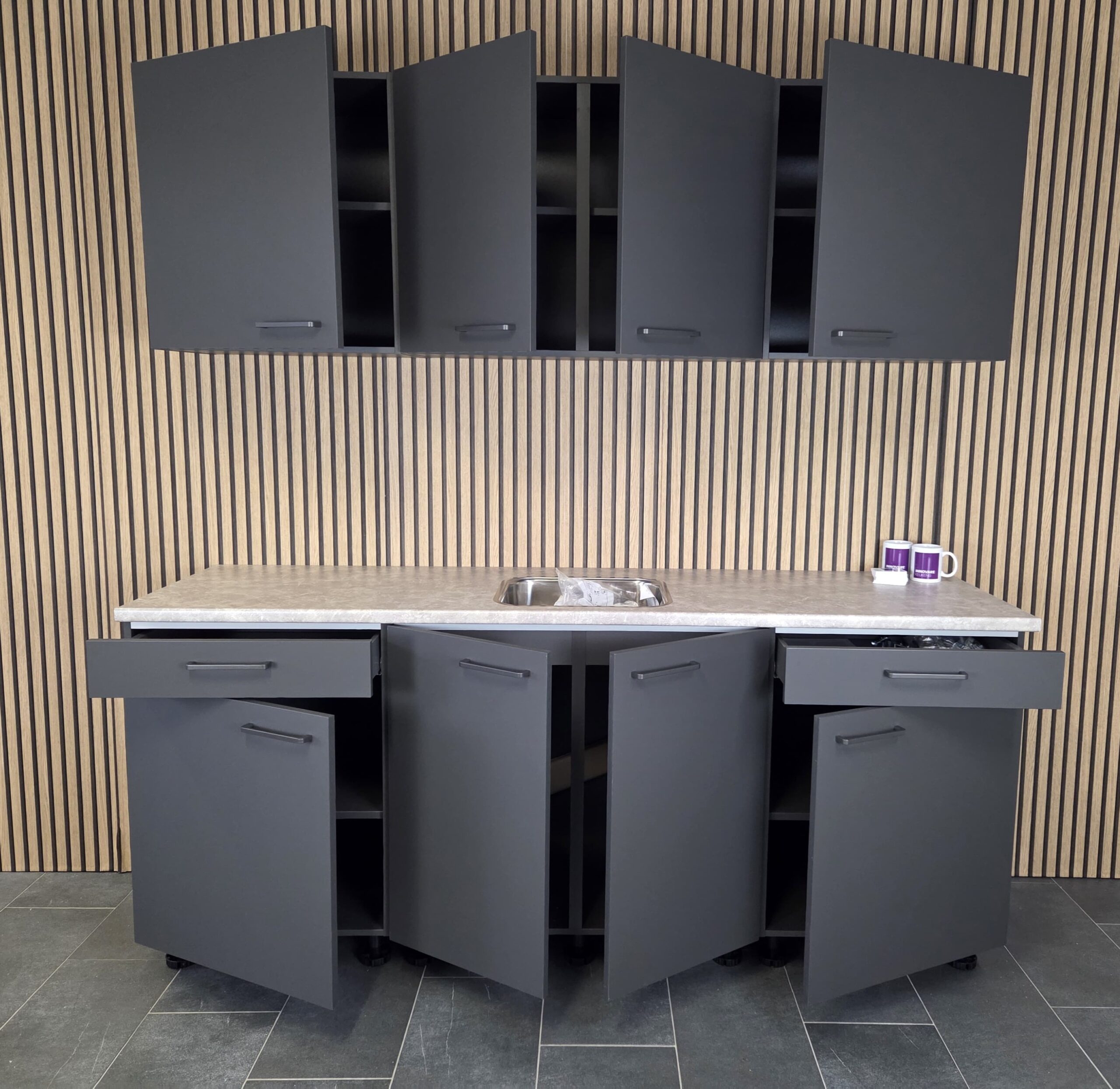 Complete keuken inclusief oerdegelijk kunststof werkblad met luxe vlakbouw spoelbak, degelijk scharnierwerk, voorzetplint, stelpoten en bovenkasten.