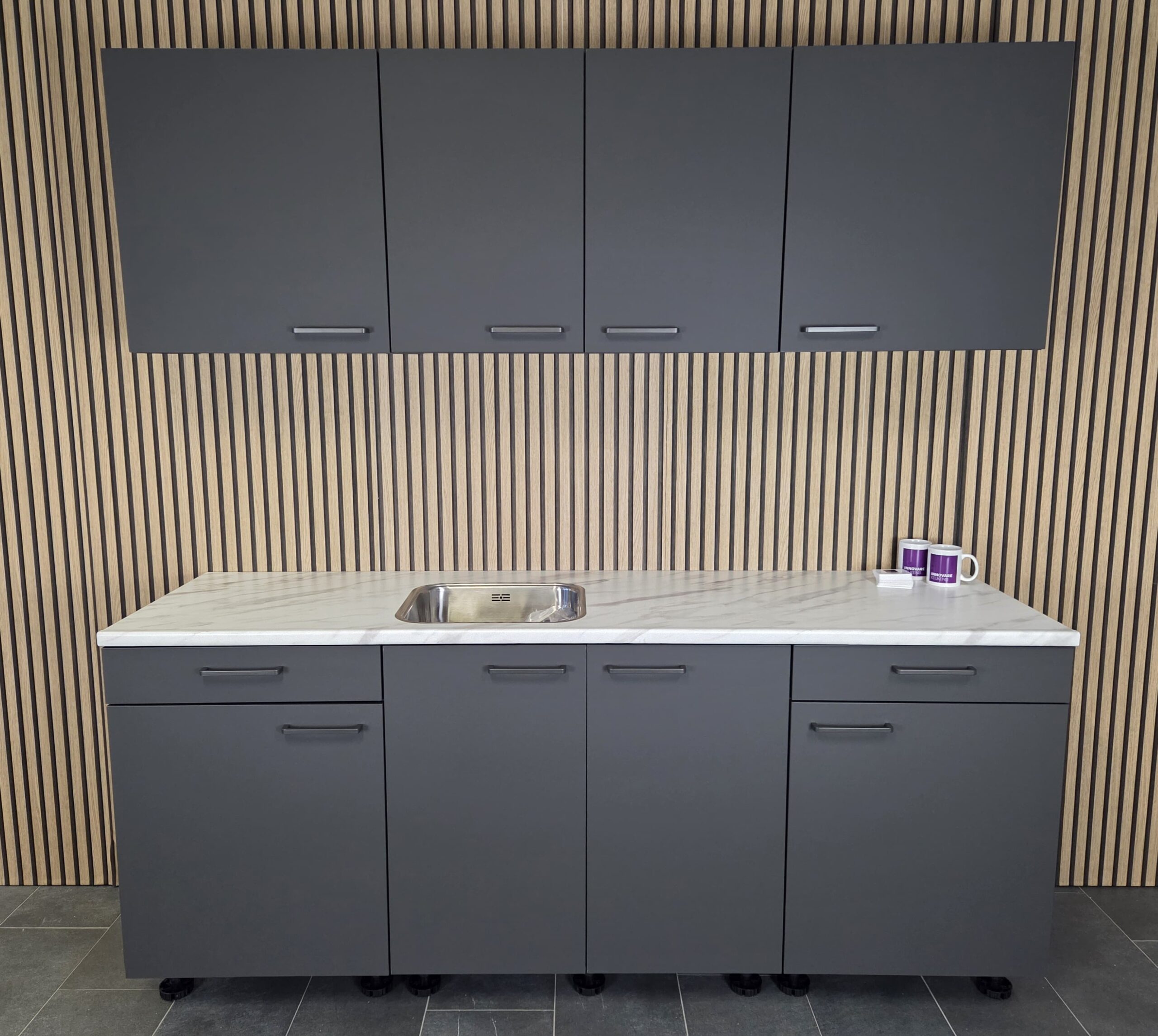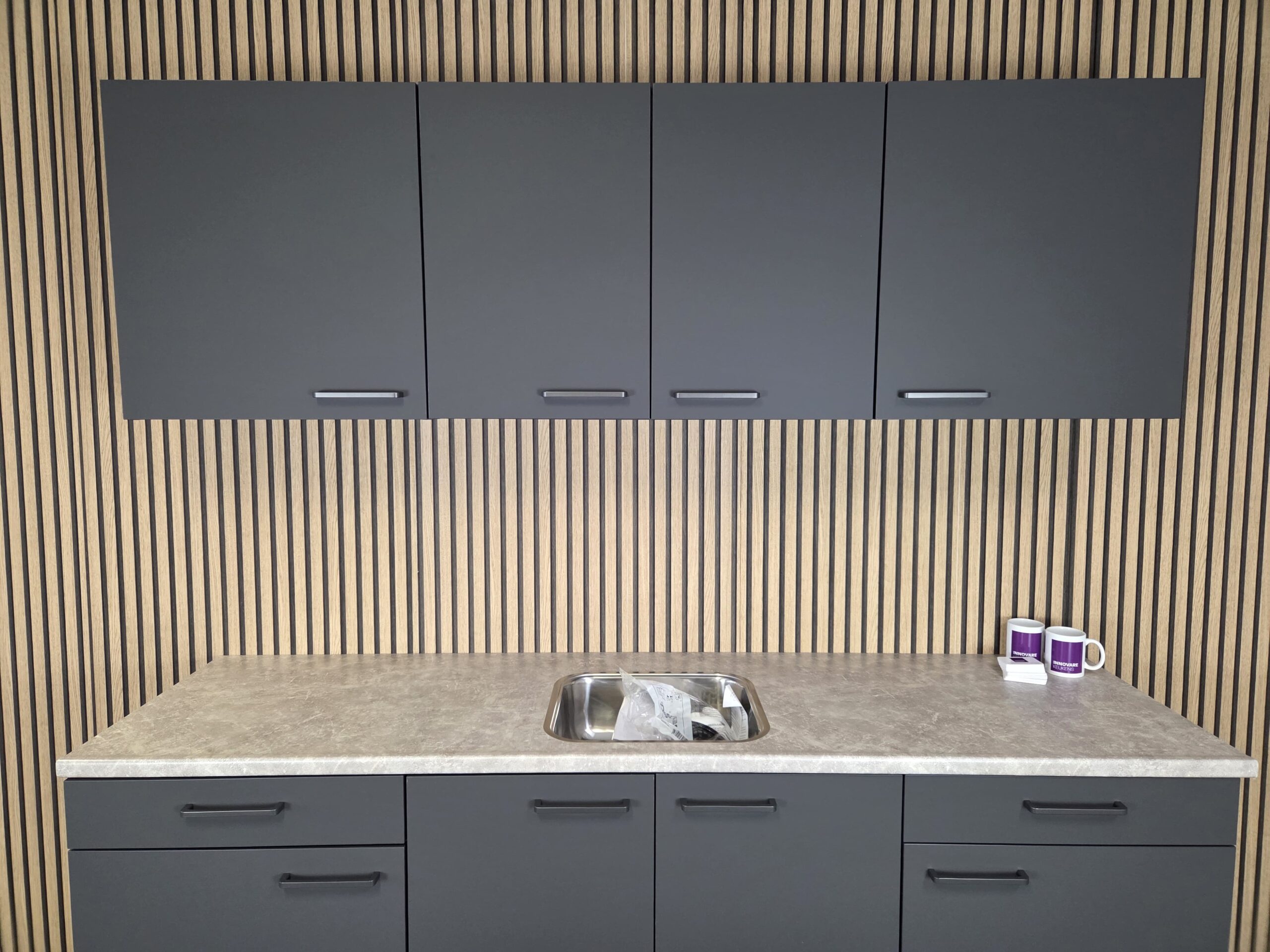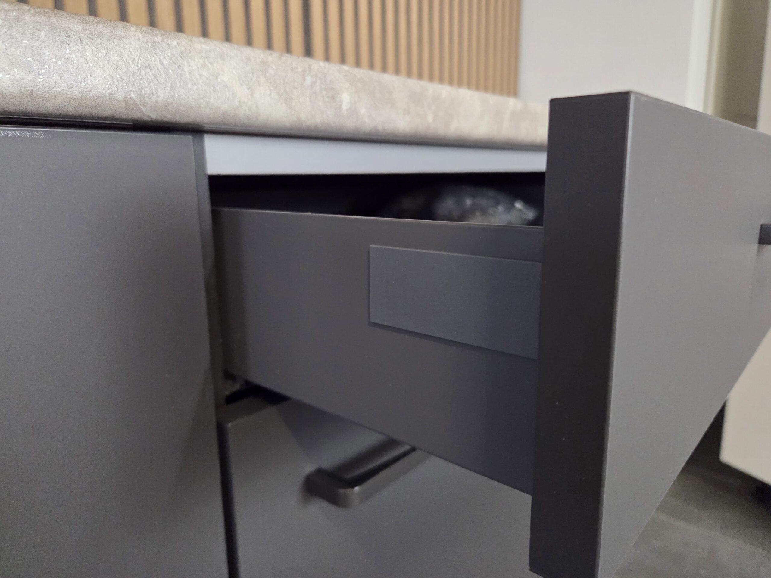 Deze keuken is uitgevoerd in een “Mat Grafiet” decor kleurstelling met titanium kleur keukengrepen.