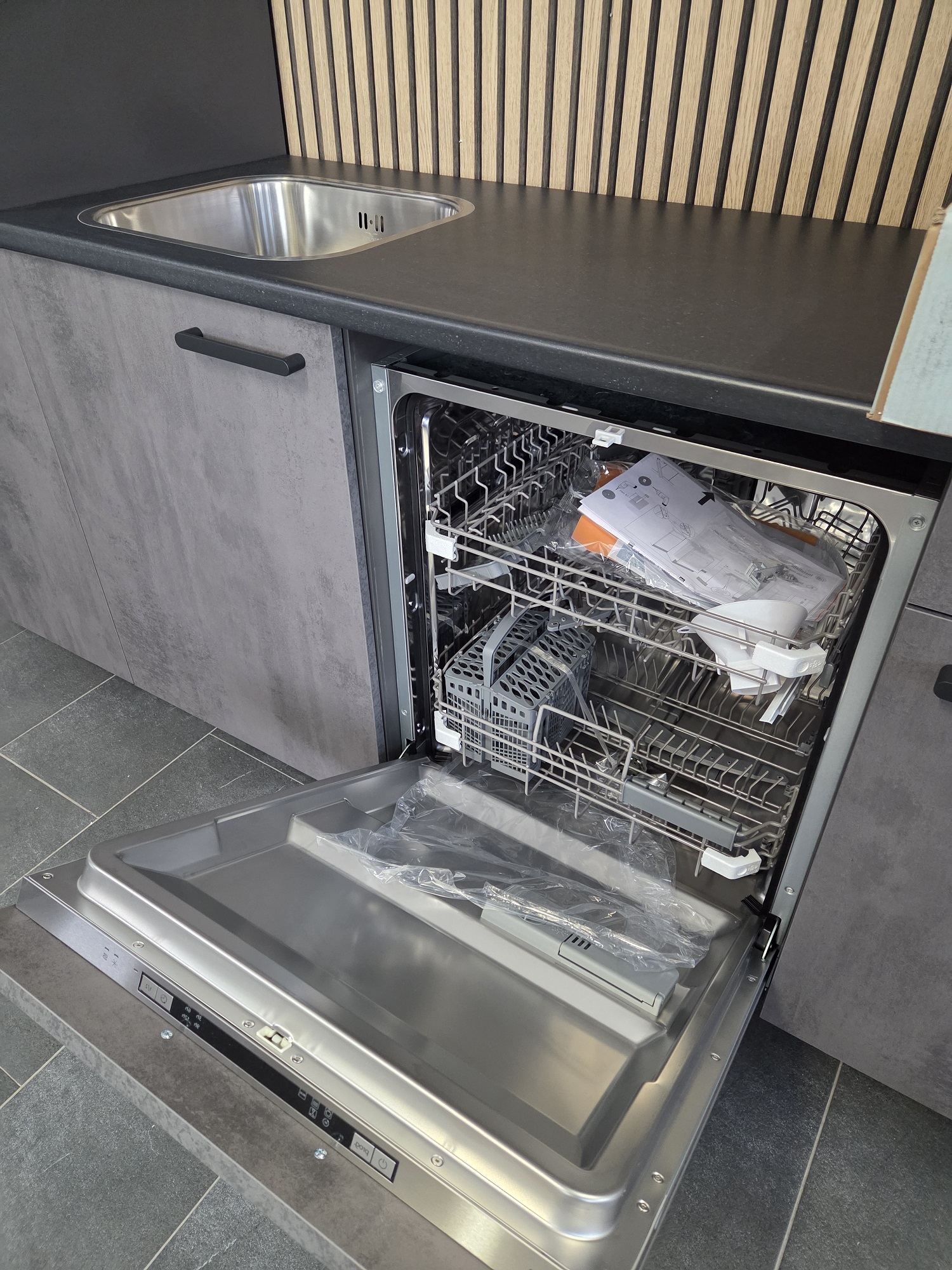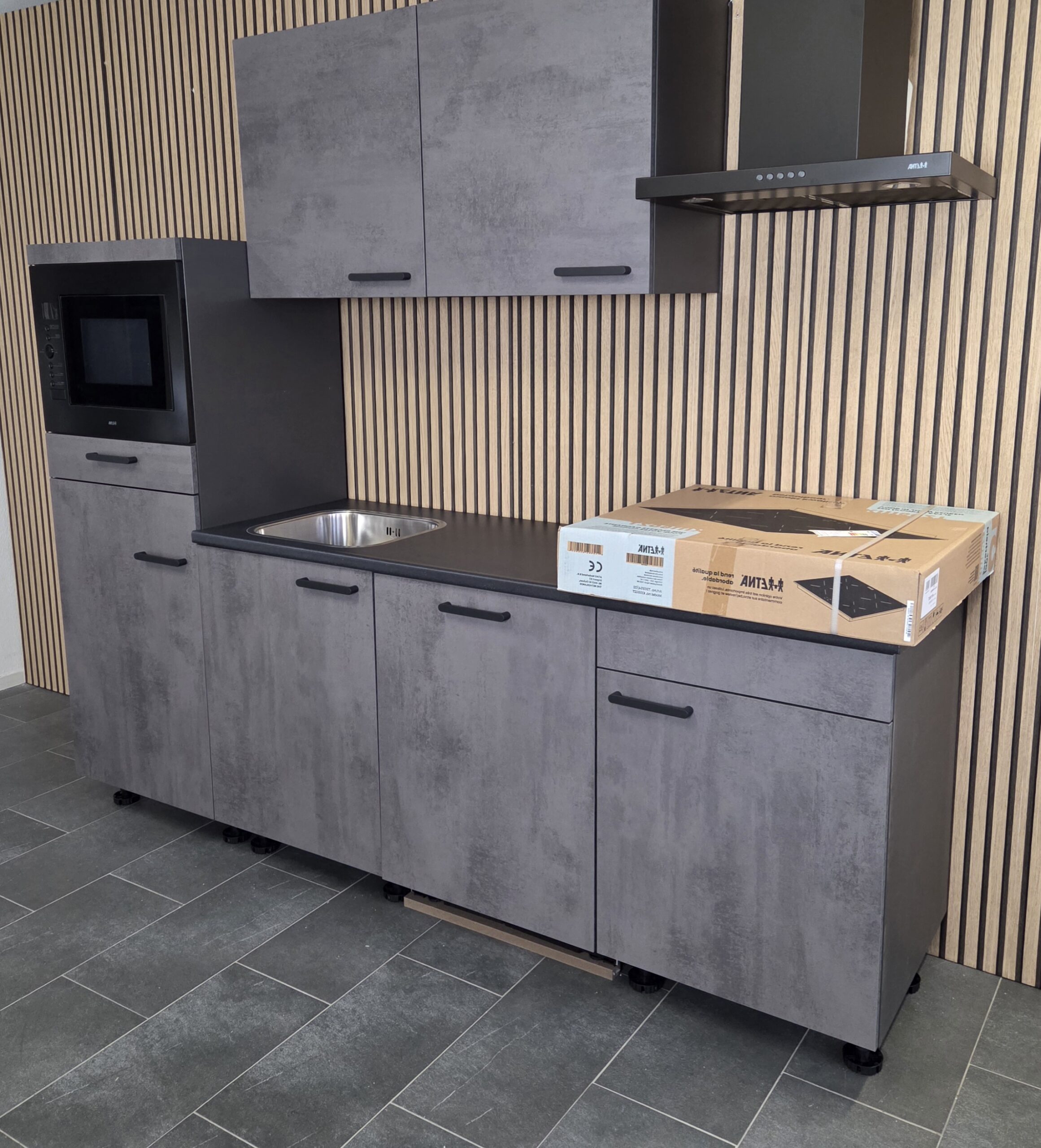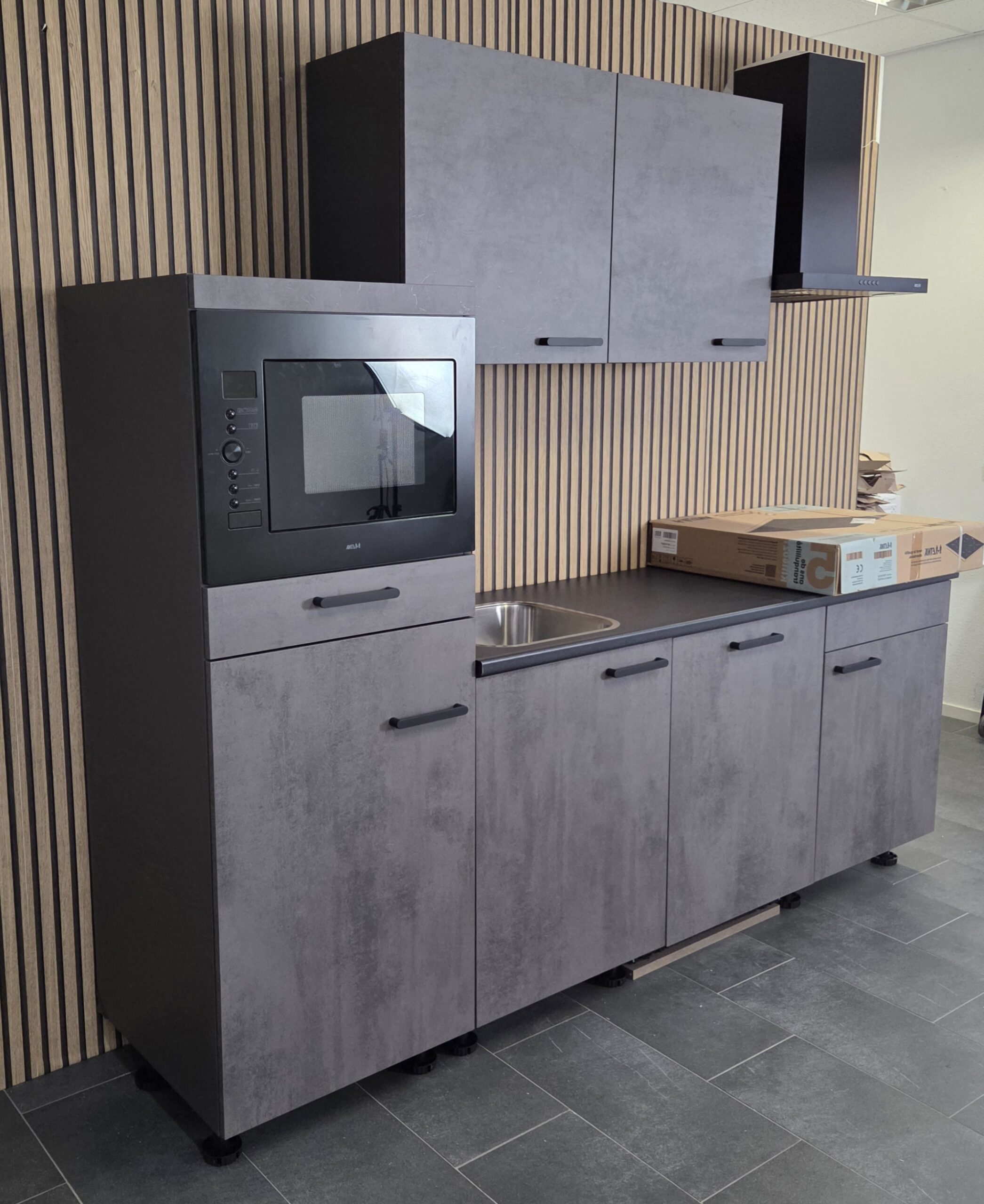 Deze keuken is uitgevoerd in een “SCHIEFER GRIJS” decor kleurstelling met titanium kleur keukengrepen.