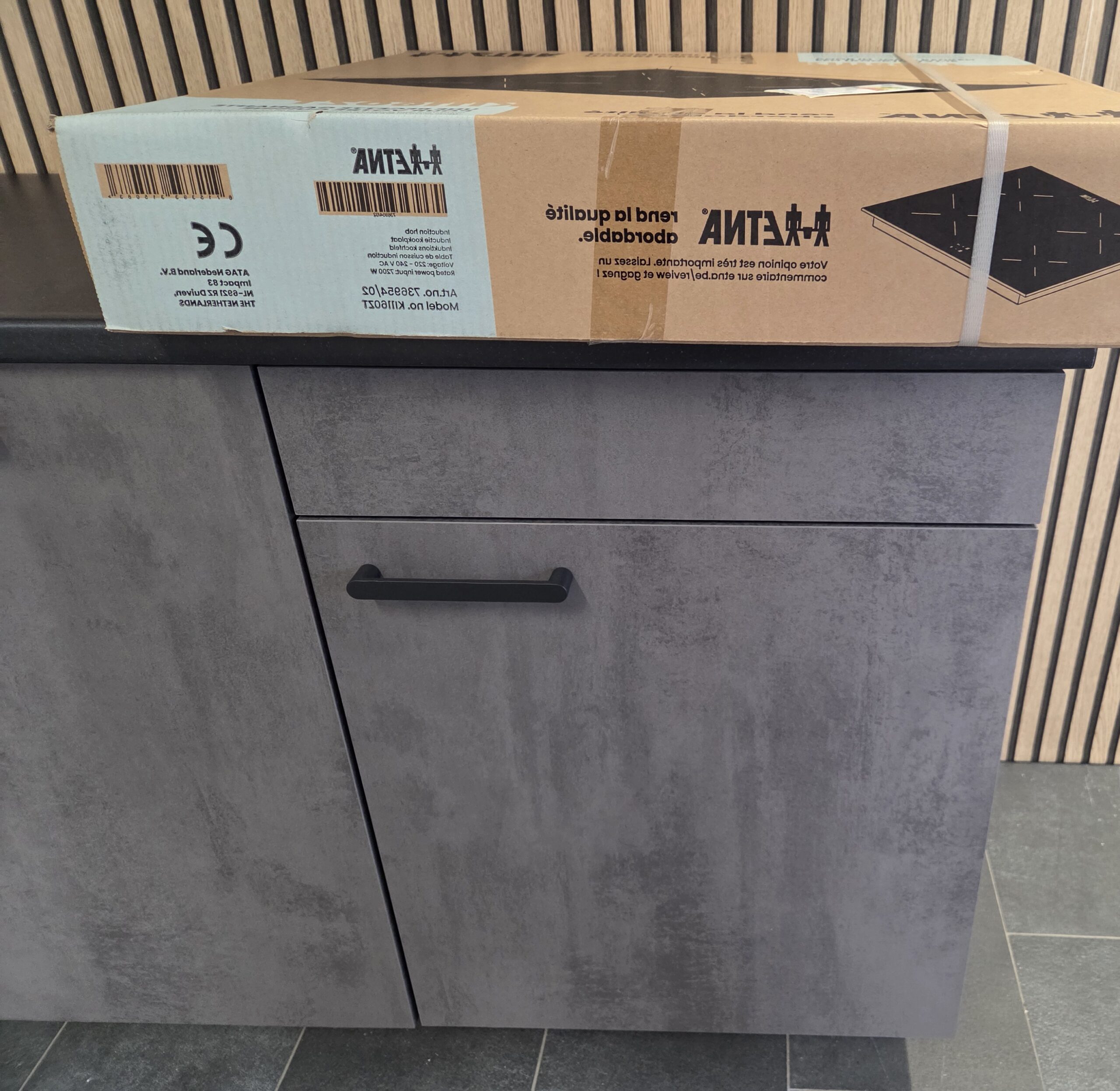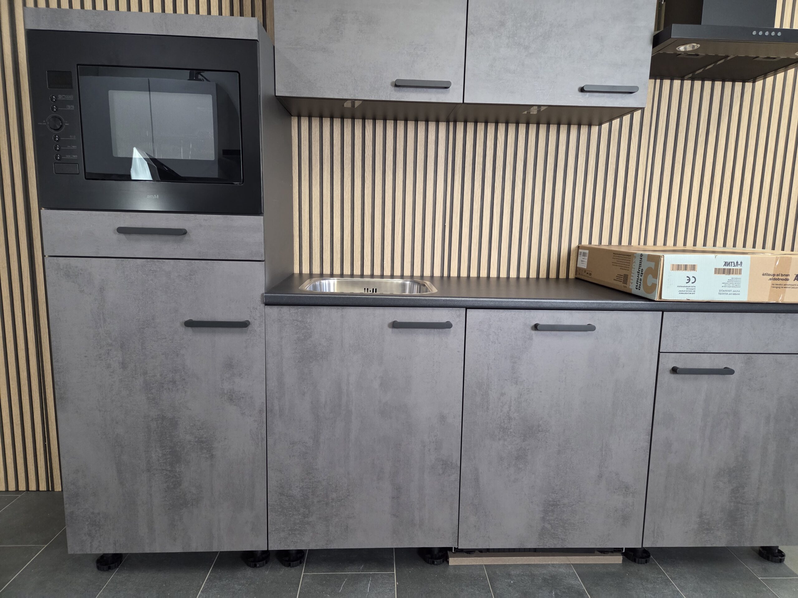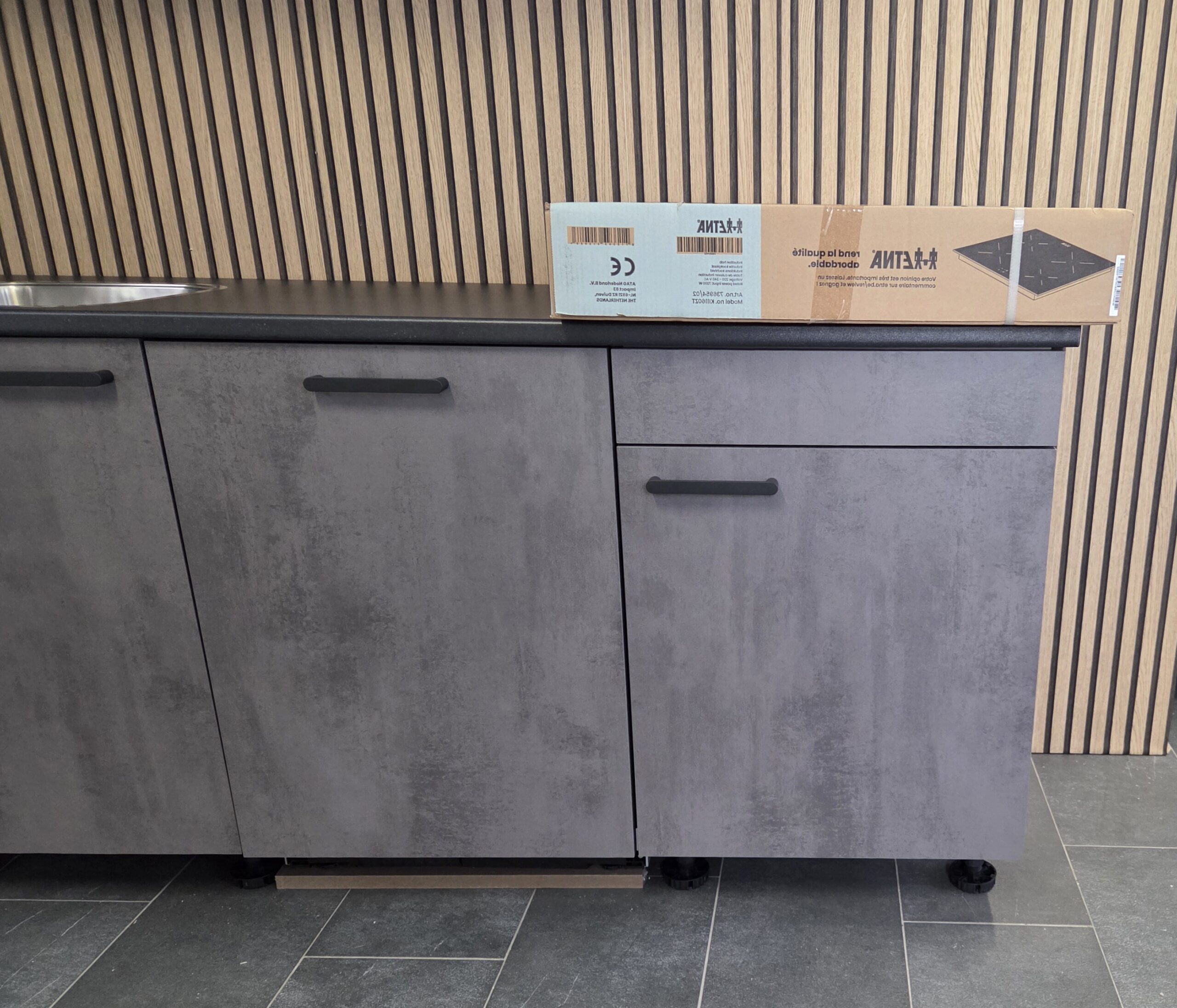 60 cm (halfhoge kast) x 60 cm (gootsteenkast) x 60 cm (vaatwasser) x 60 cm