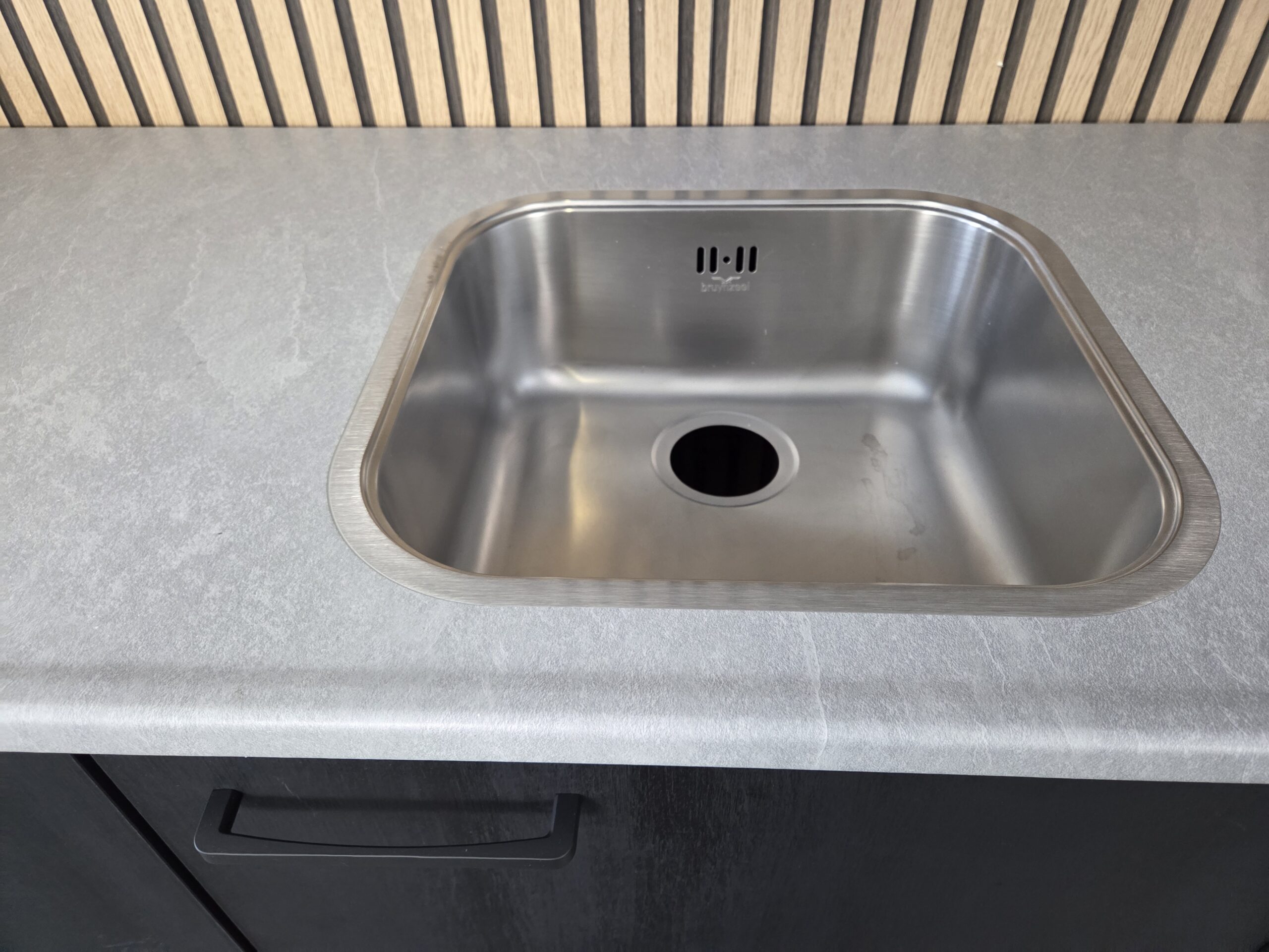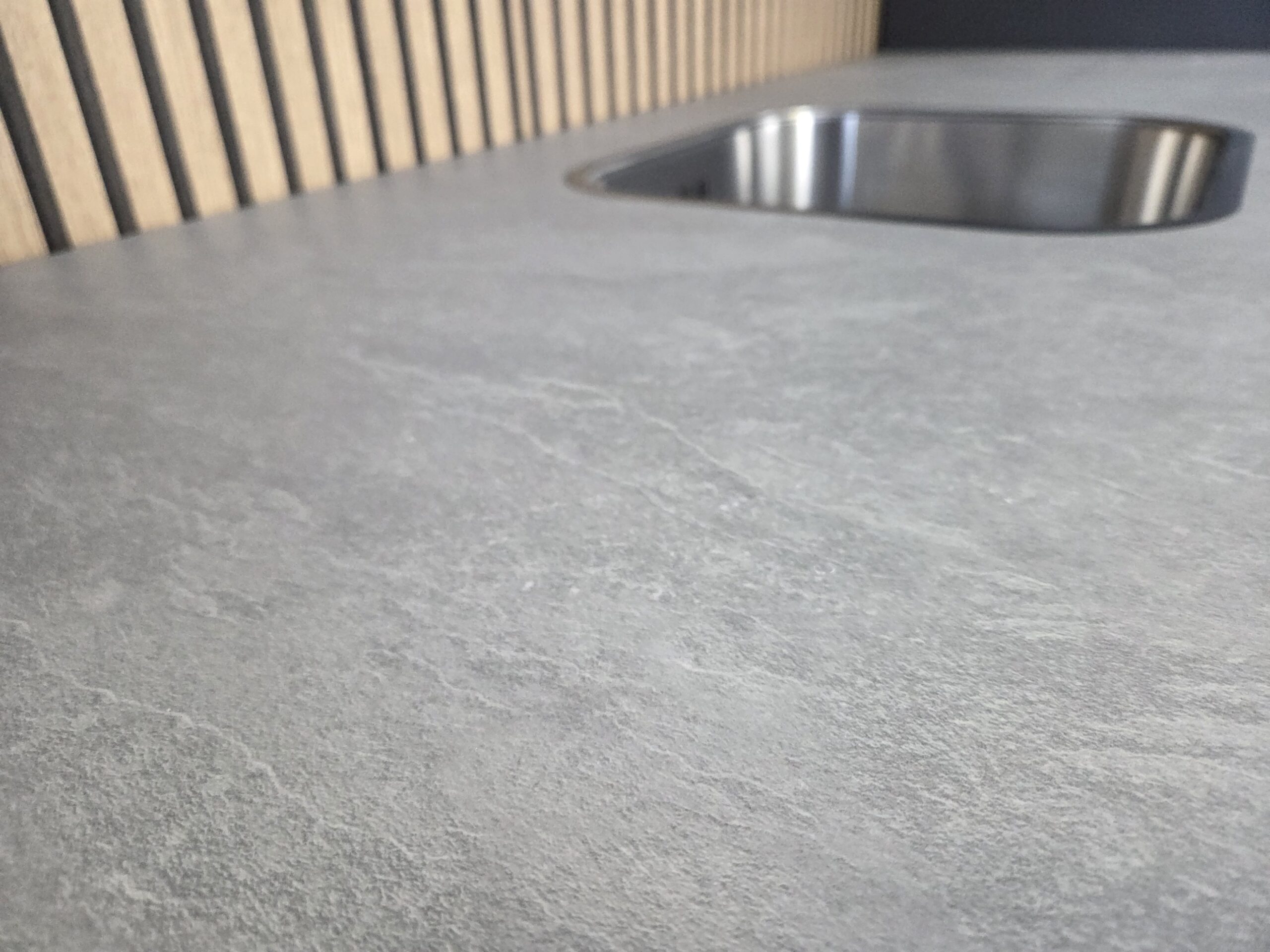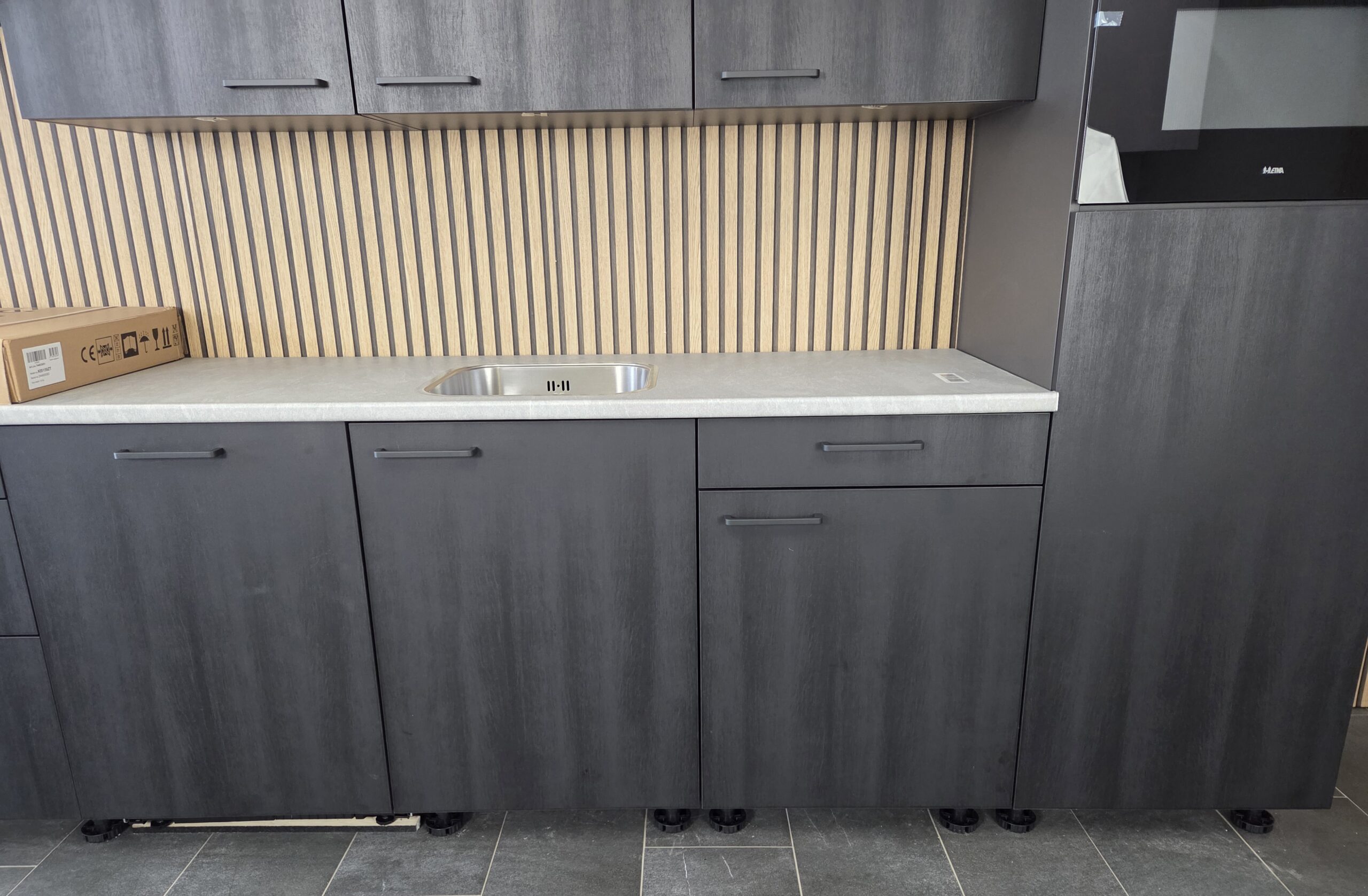 Complete keuken inclusief oerdegelijk kunststof werkblad met luxe vlakbouw spoelbak, degelijk scharnierwerk, voorzetplint, stelpoten en bovenkasten.