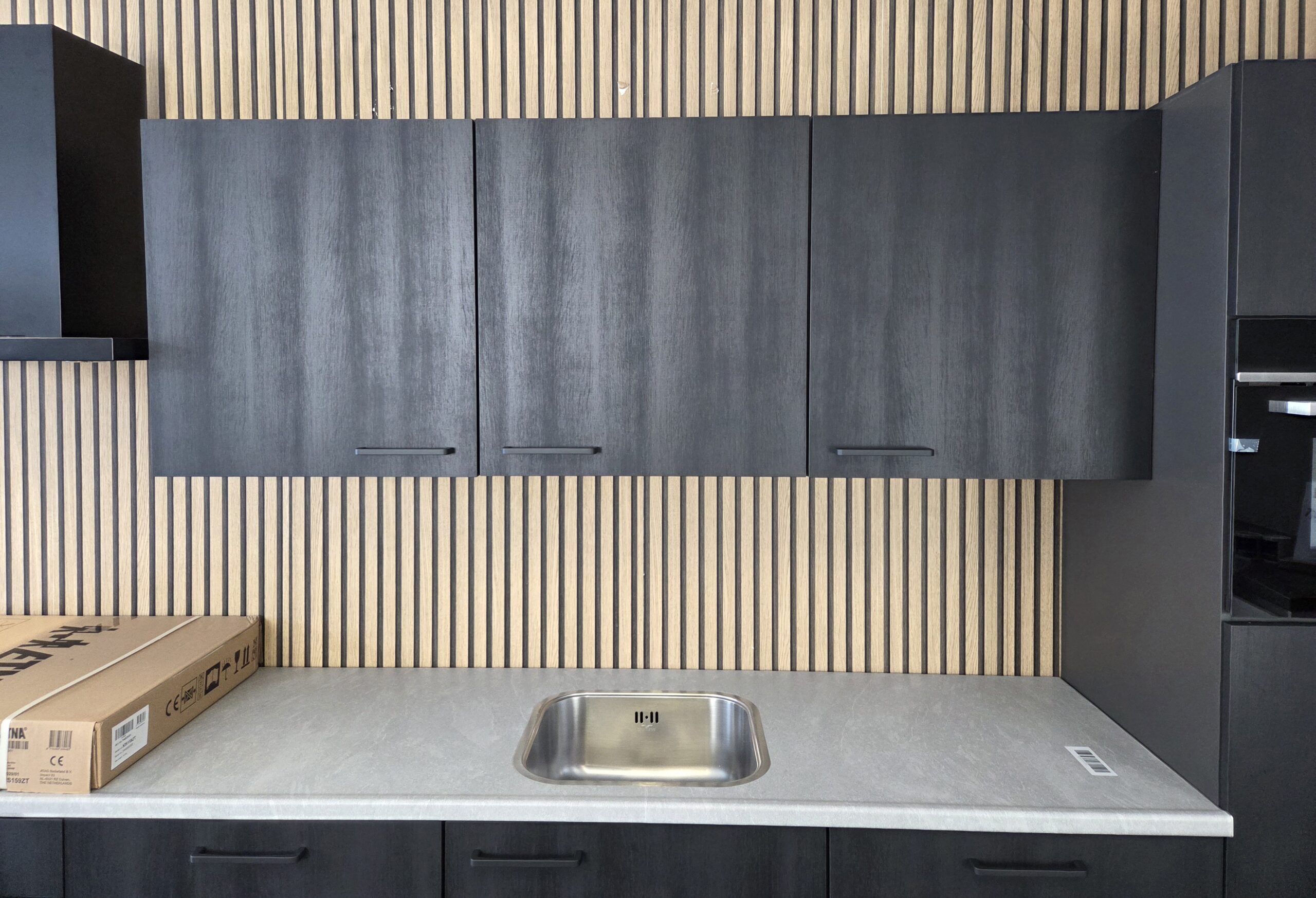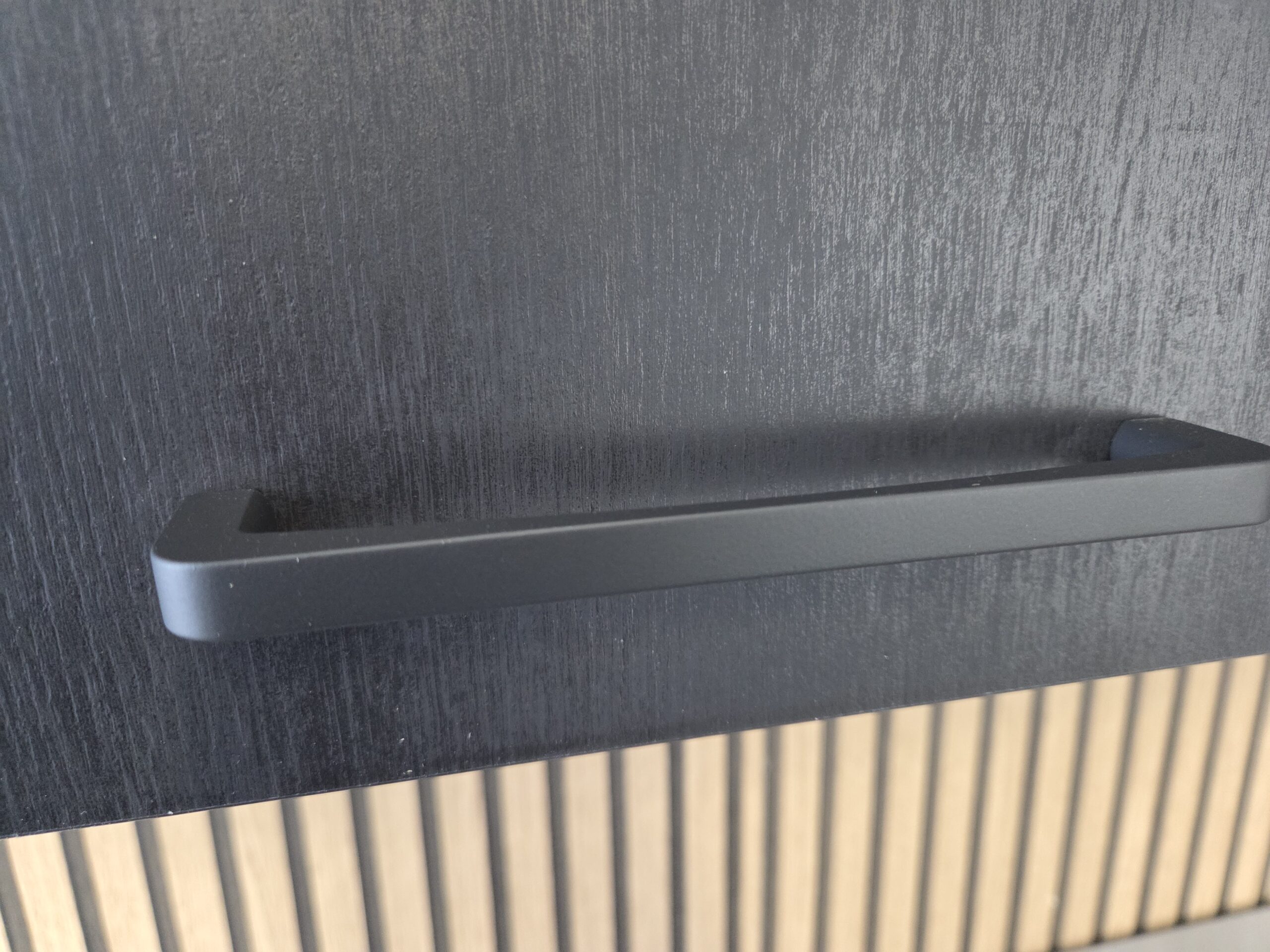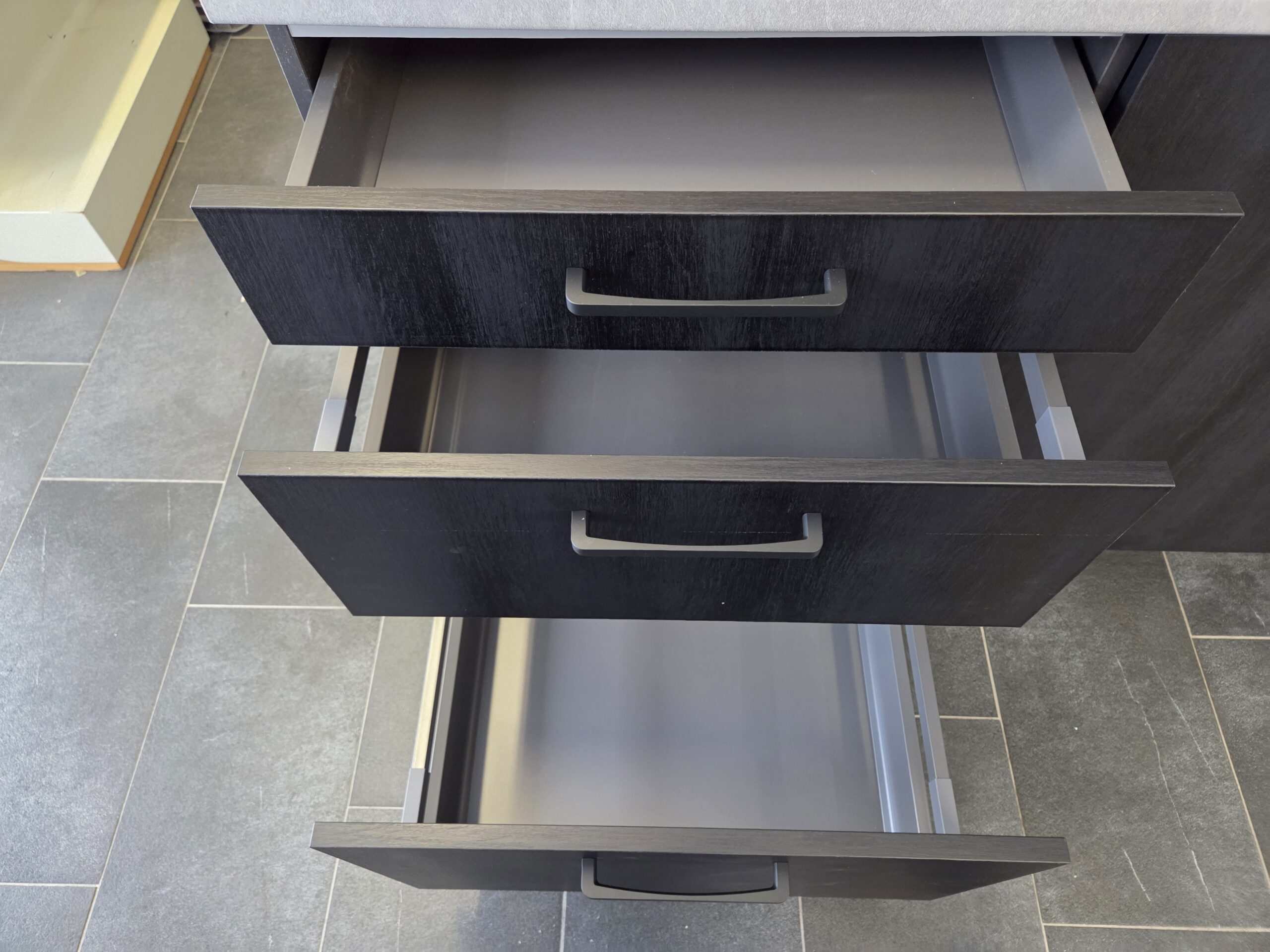 Deze keuken is uitgevoerd in een “ROOK EIKEN HOUTLOOK” decor kleurstelling met mat zwart kleurige keukengrepen.