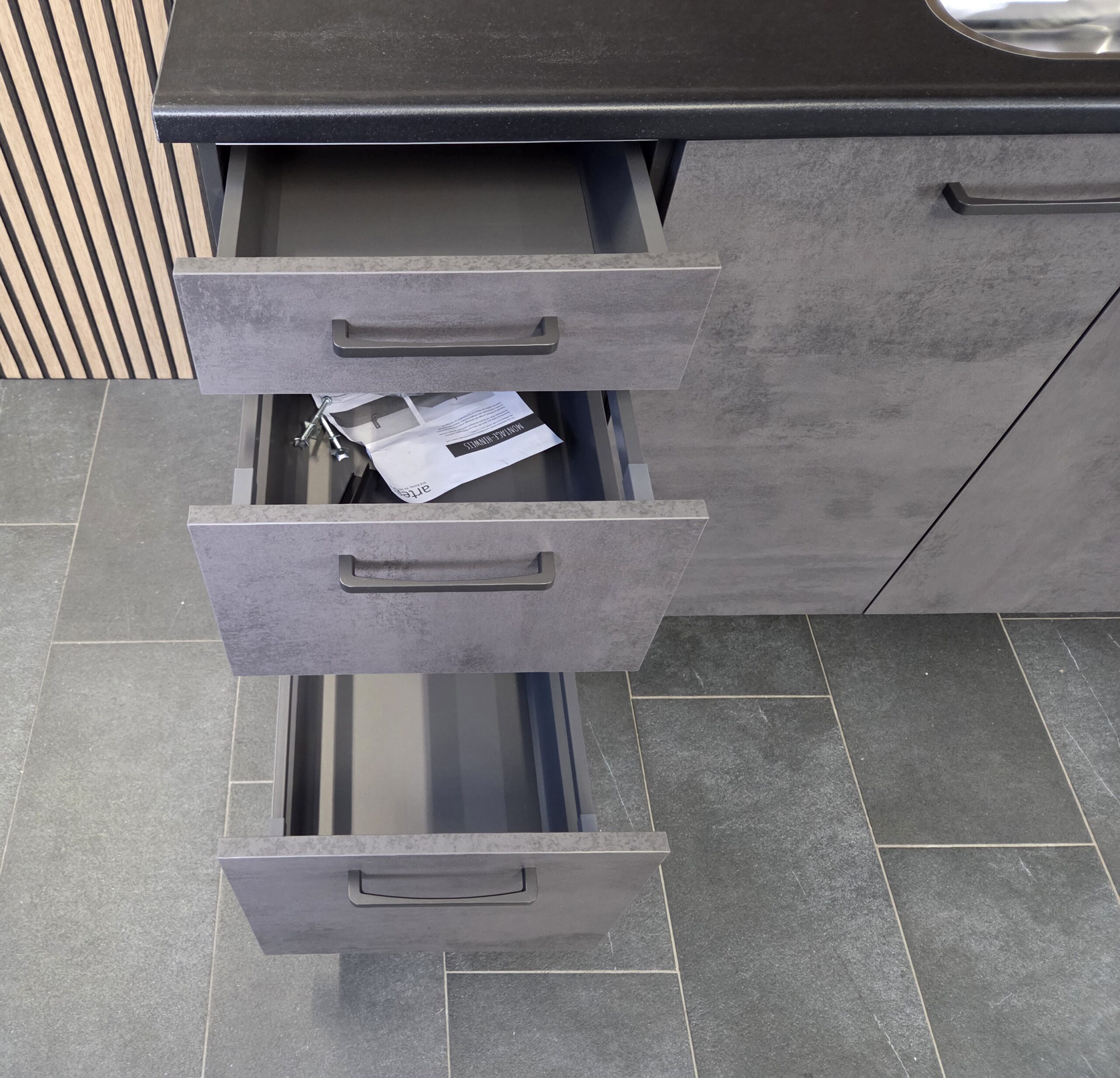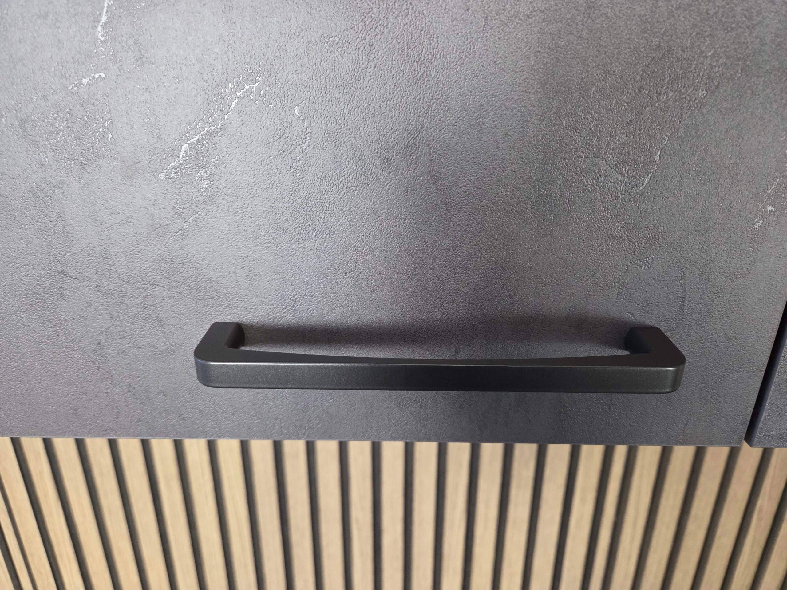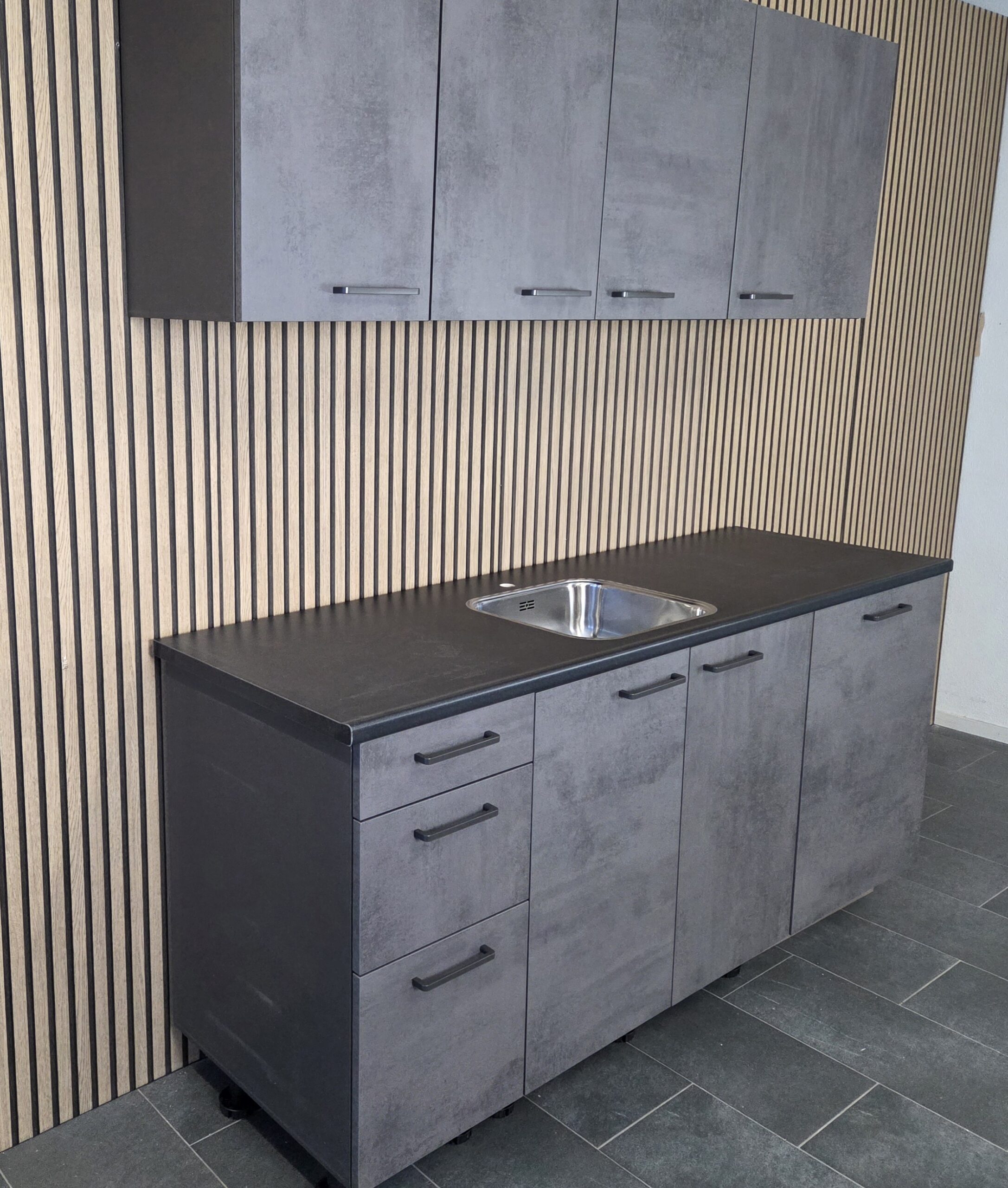 Deze keuken is uitgevoerd in een “SCHIEFER GRIJS STRUCTUUR”  decor kleurstelling met titanium kleur keukengrepen.