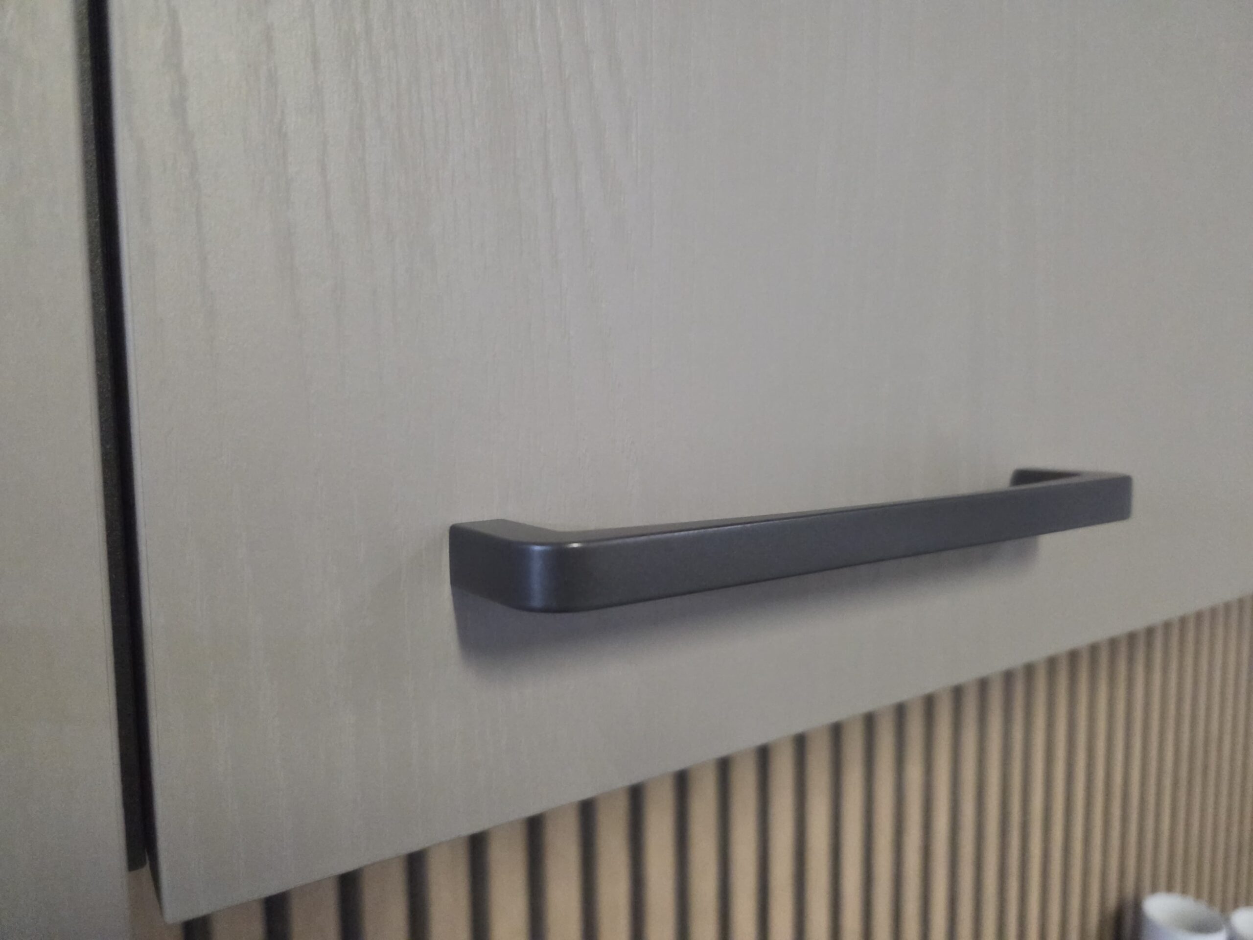 Deze keuken is uitgevoerd in een “TAUPE STRUCTUUR” decor kleurstelling met titanium kleur keukengrepen.