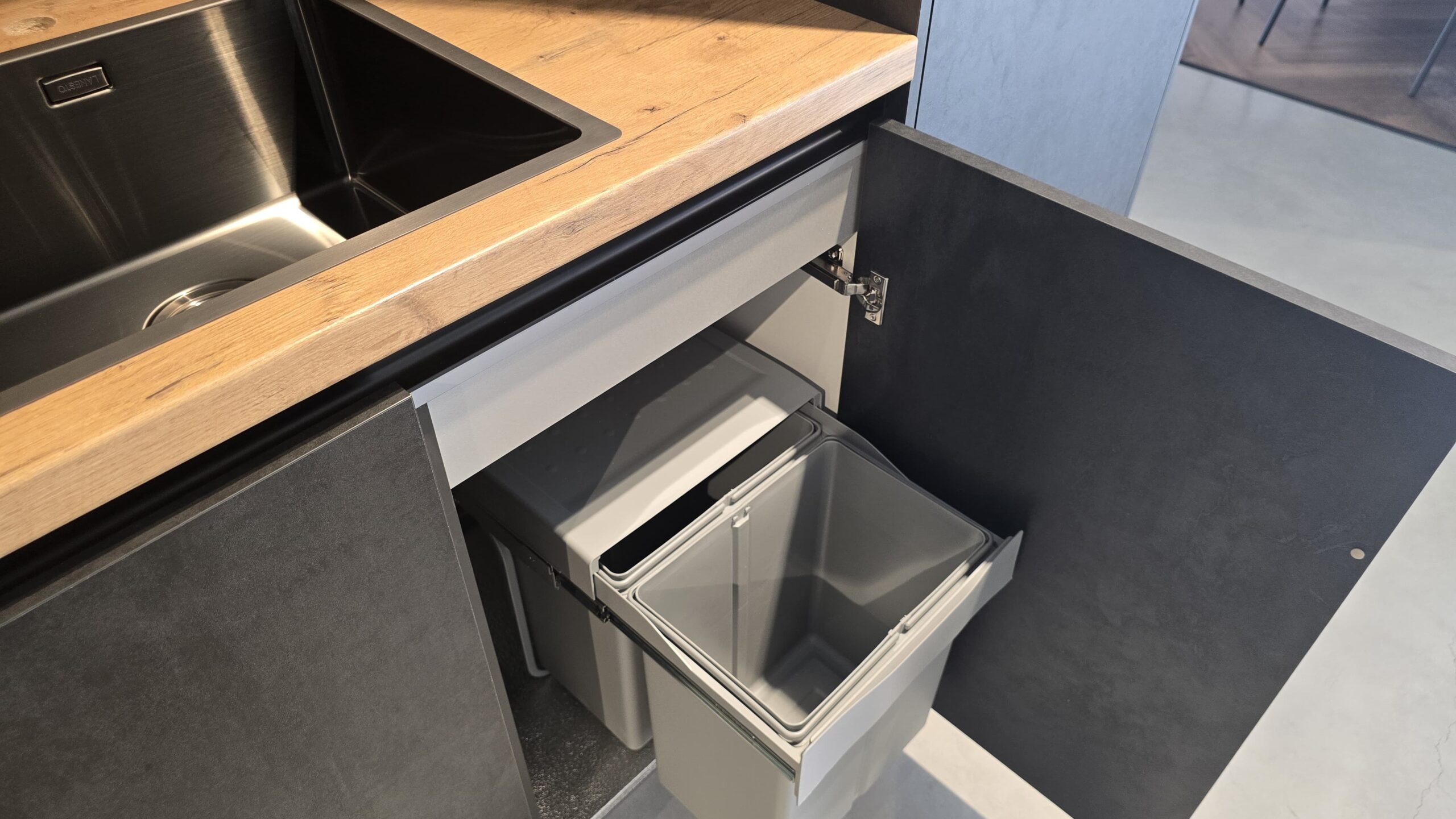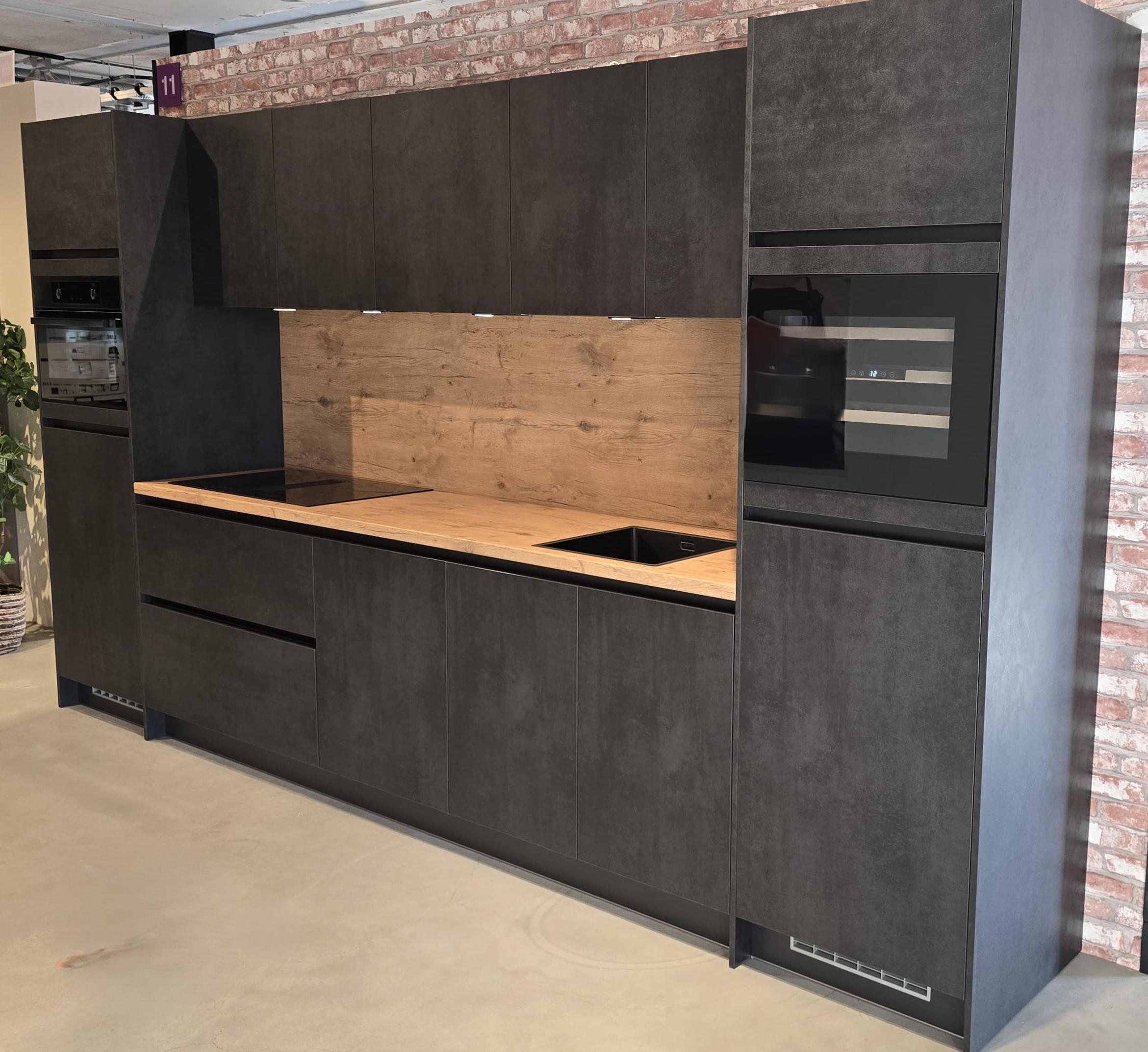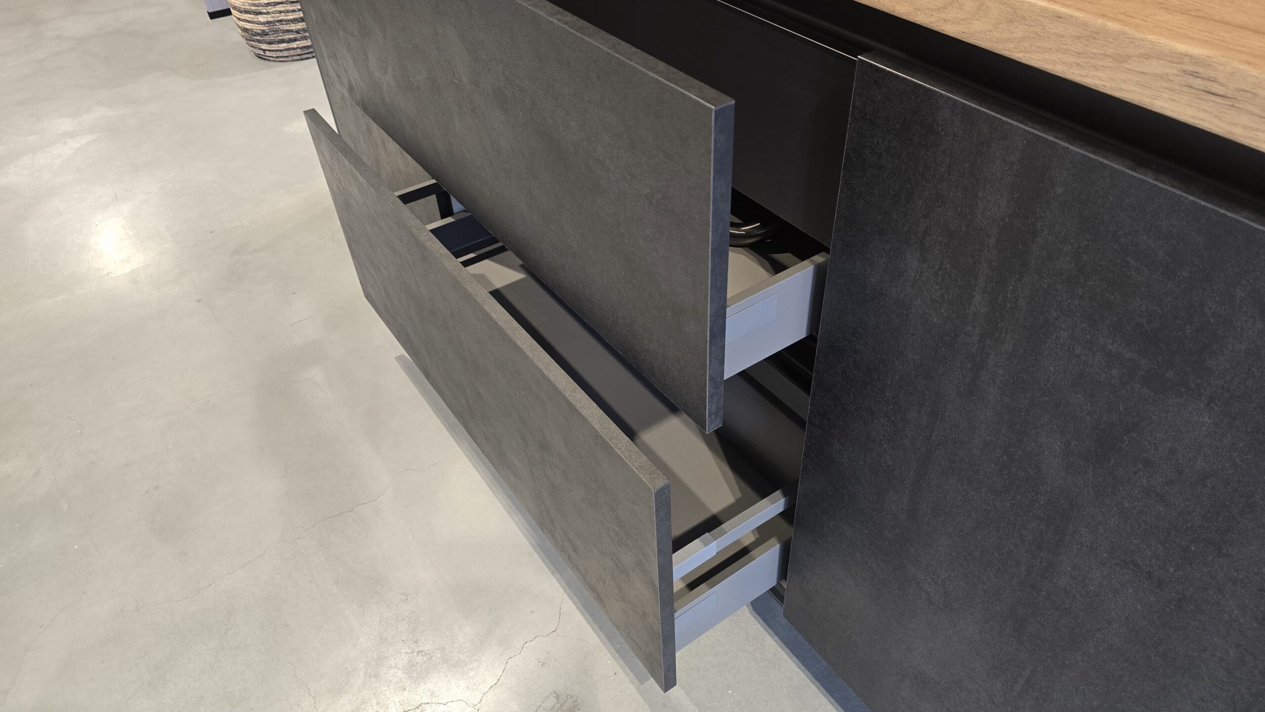 Deze keuken is uitgevoerd in een “Beton Infinity BLACK” decor kleurstelling en uitgevoerd in een ruime opstelling én greeploos design….