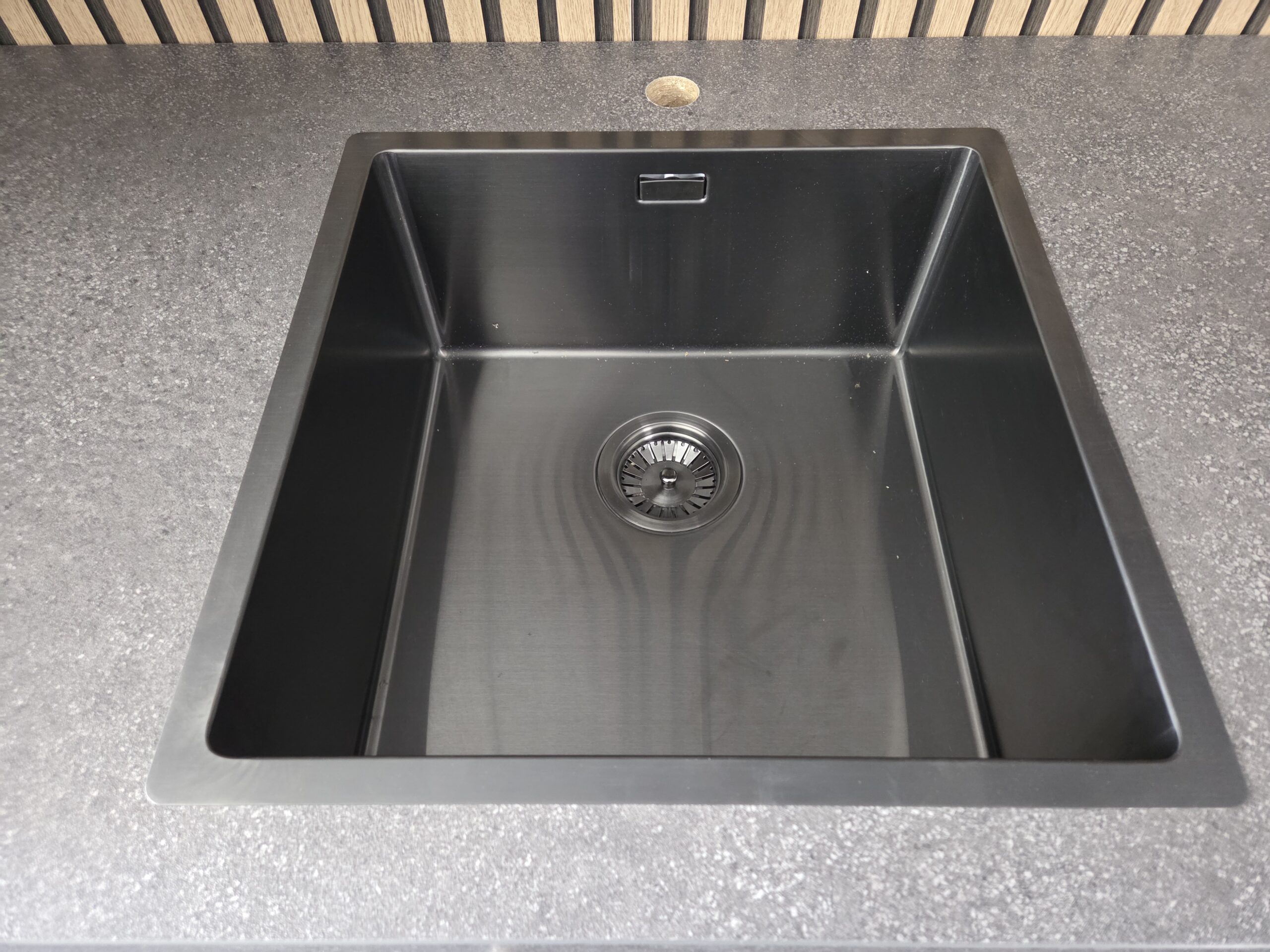Complete keuken inclusief oerdegelijk kunststof werkblad met luxe opbouw spoelbak, degelijk scharnierwerk, voorzetplint, stelpoten en bovenkasten.