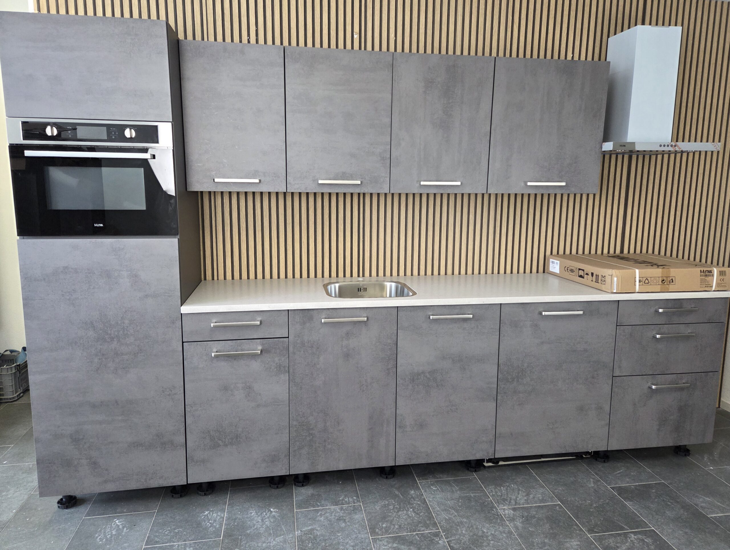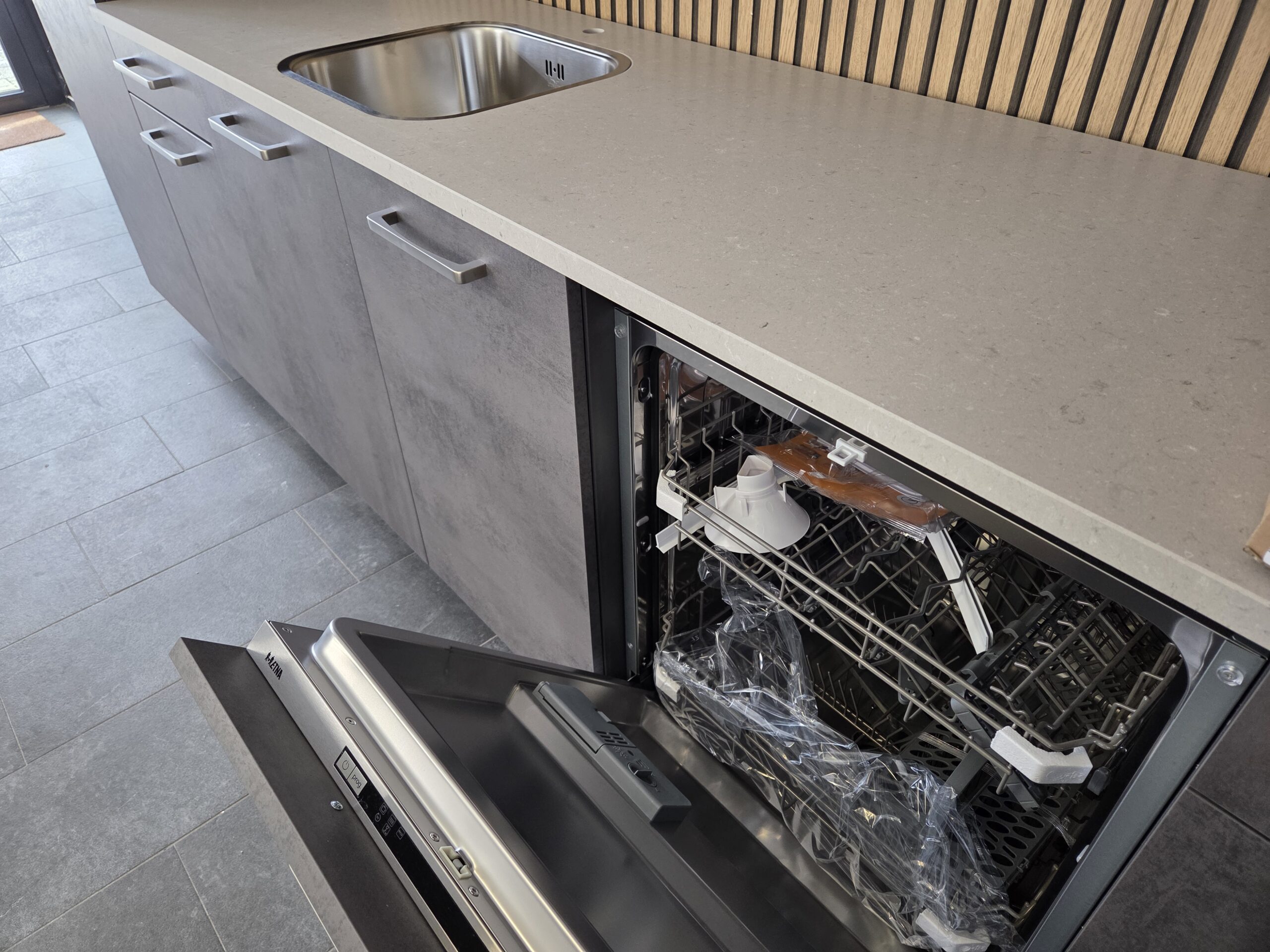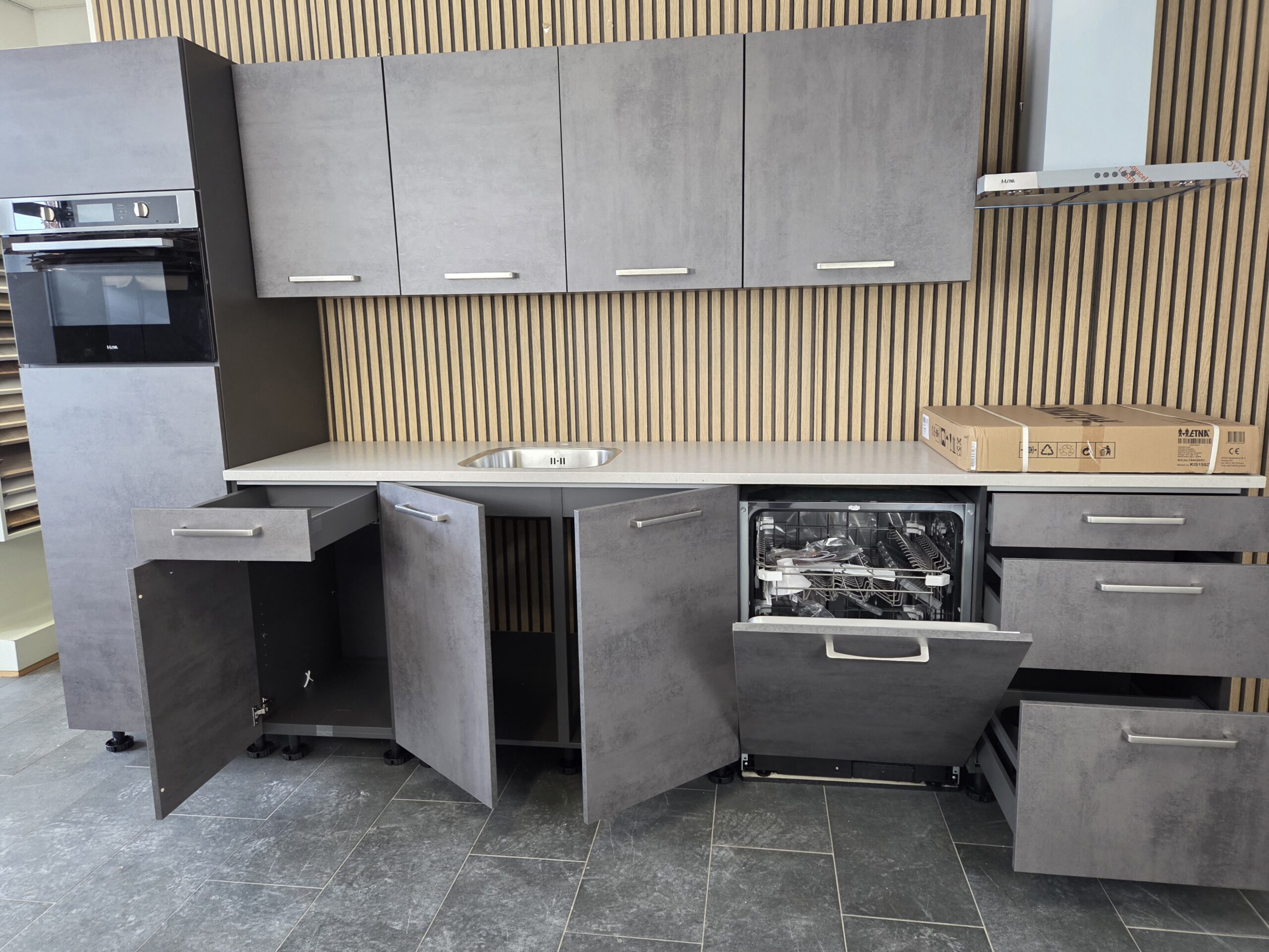 Een Q-Line ARTEGO A-Merk Keuken in een afmeting van ca. 325 cm, uitgevoerd in een warme “SCHIEFER GRIJS” kleurstelling.