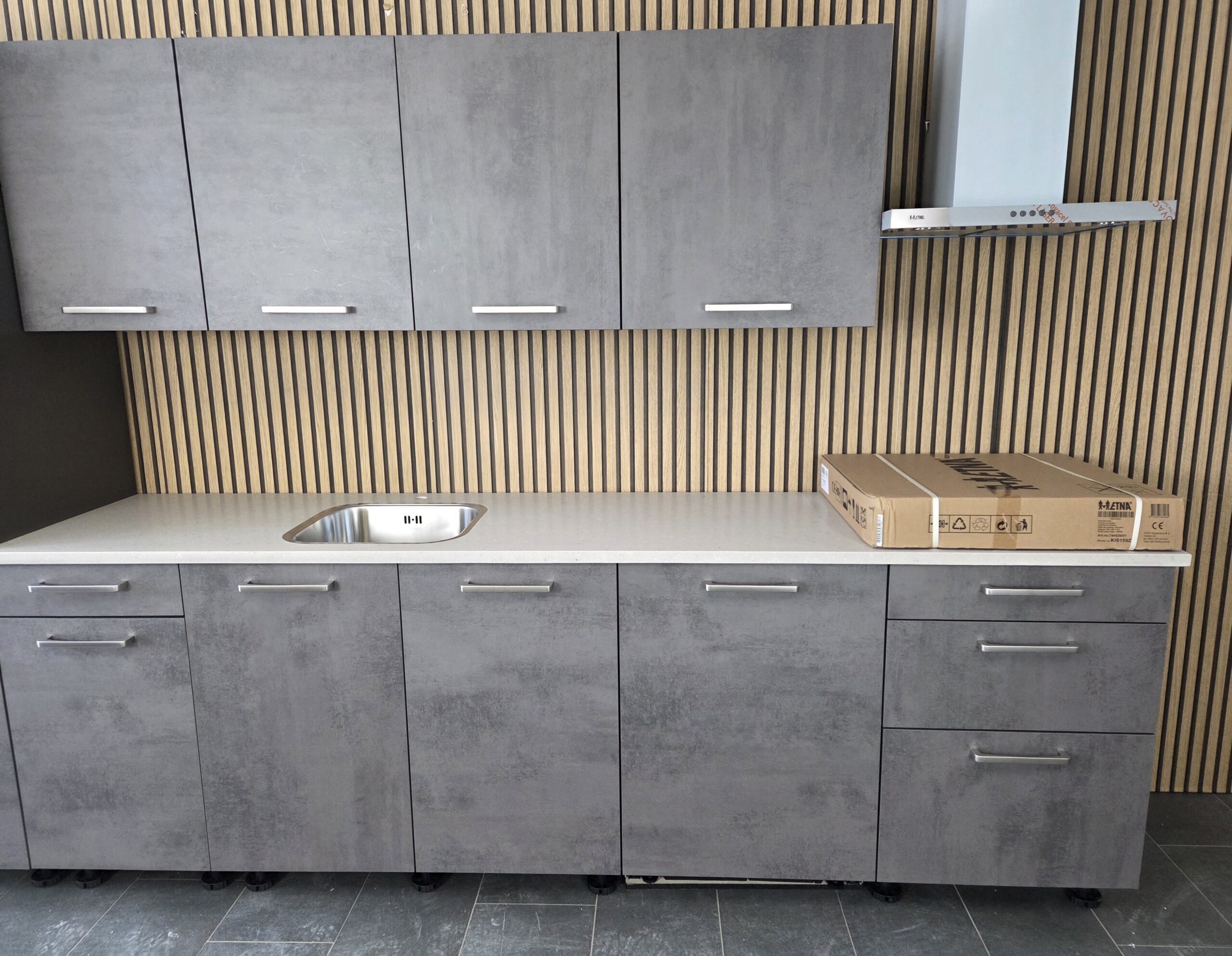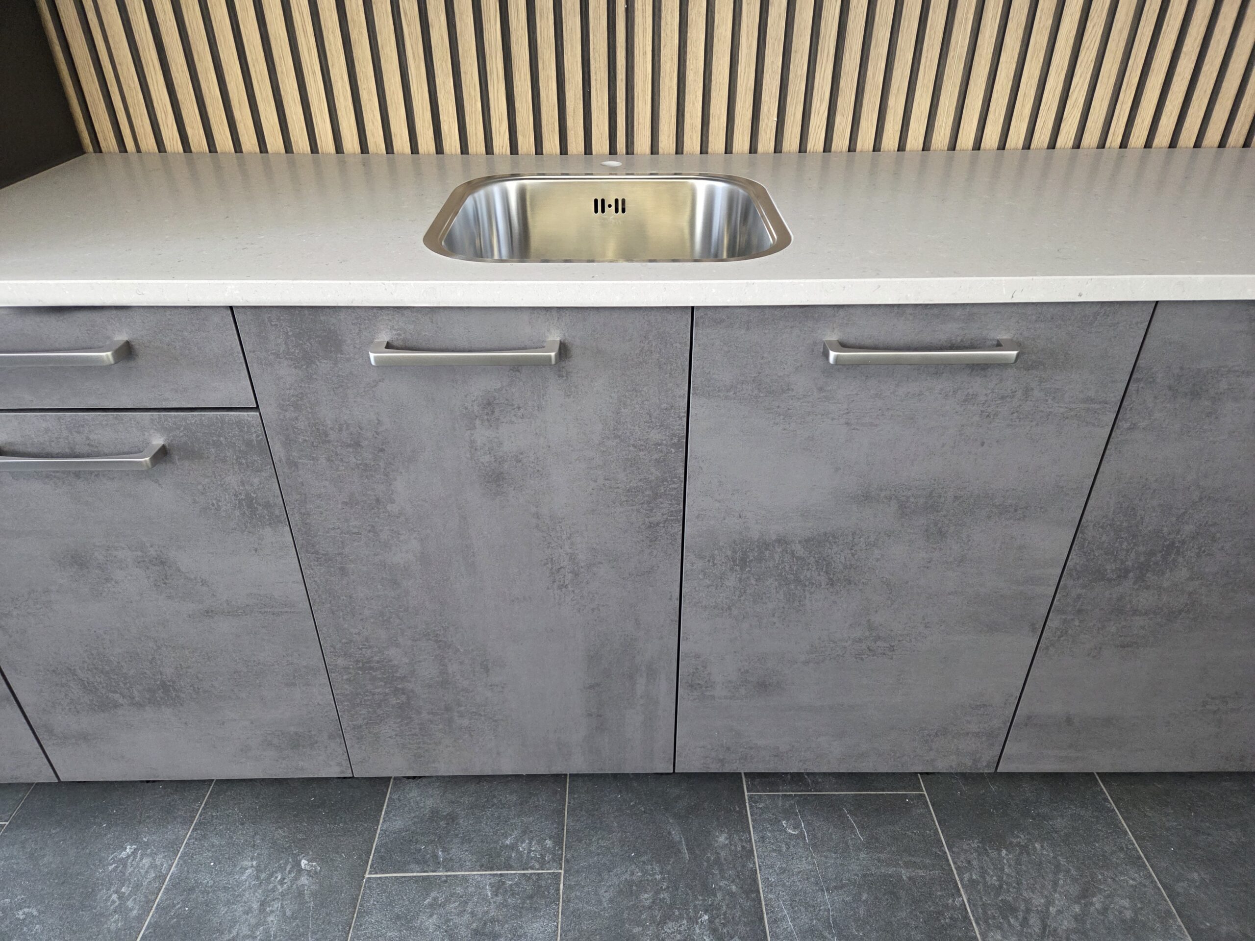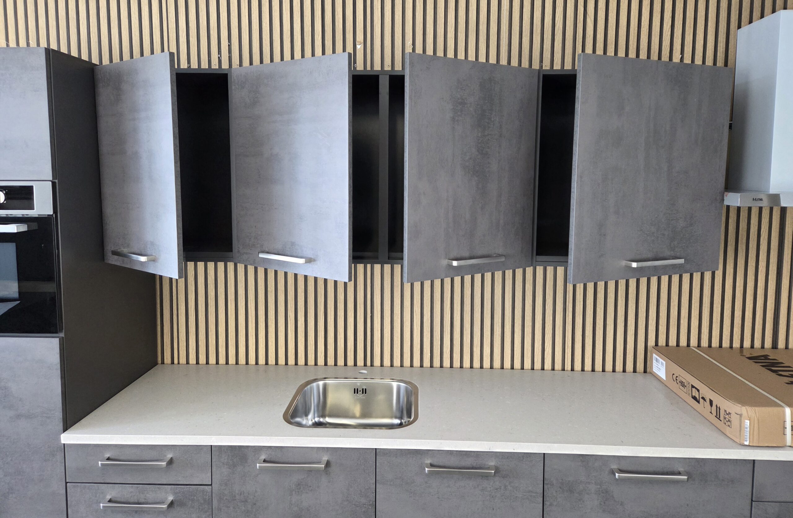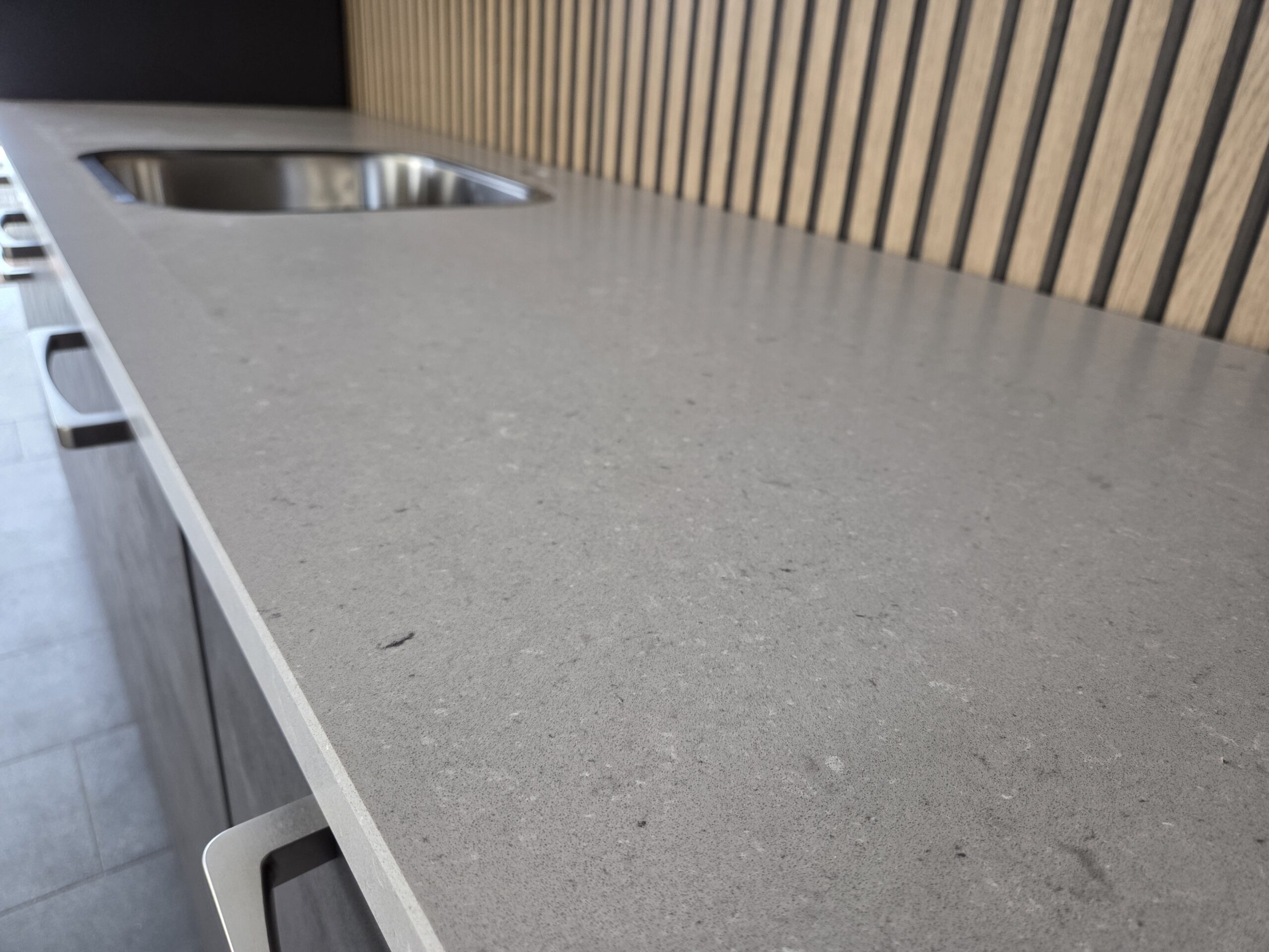 Een Q-Line ARTEGO A-Merk Keuken in een afmeting van ca. 325 cm, uitgevoerd in een warme “SCHIEFER GRIJS” kleurstelling.